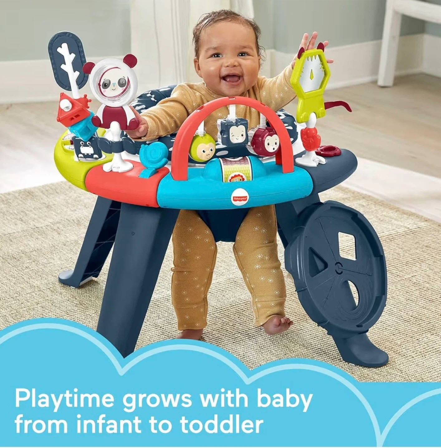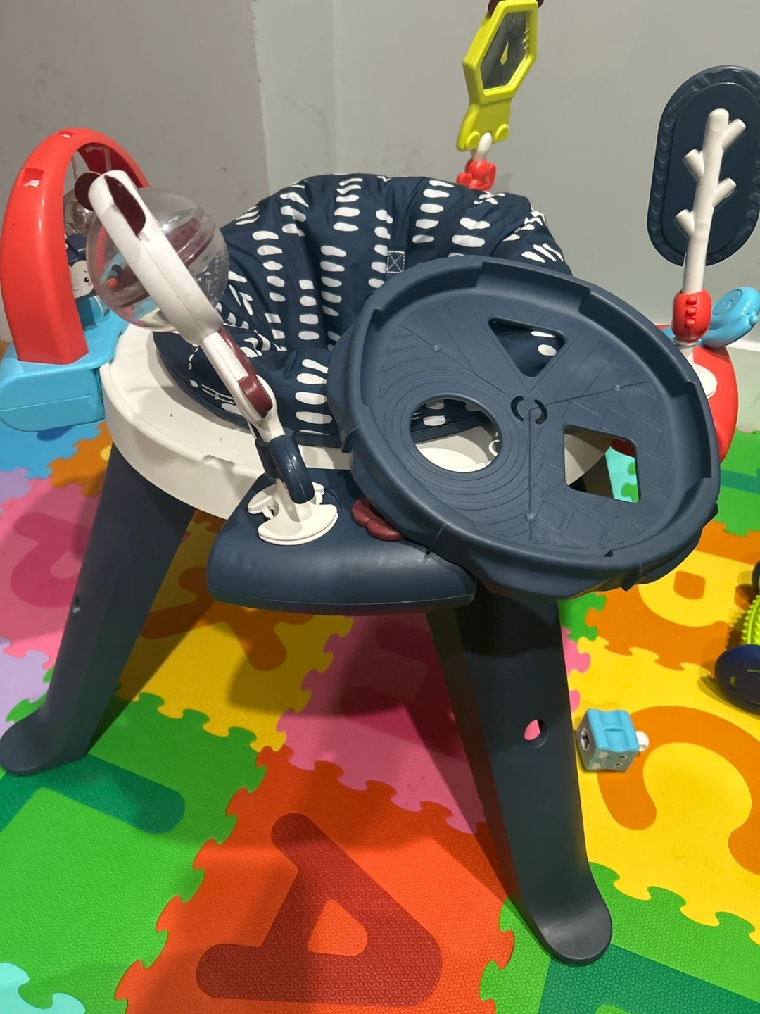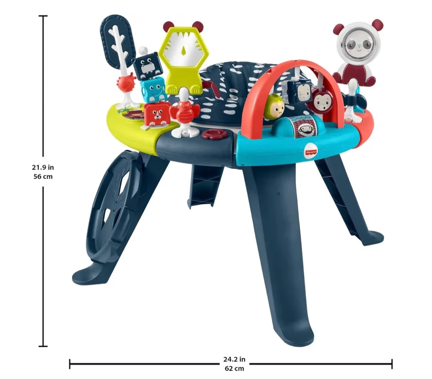 This Fisher-Price activity center features a 360-degree seat with a spinning play experience. It includes multiple toys and activities for baby's development. The seat pad is machine washable. Recommended for babies up to 25 lbs.