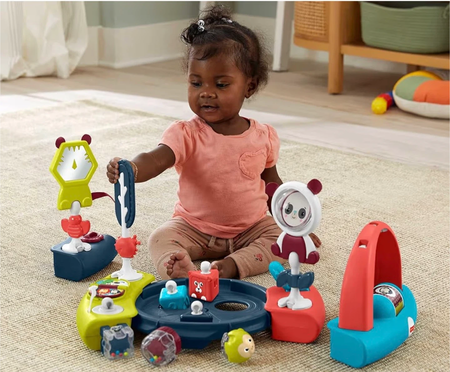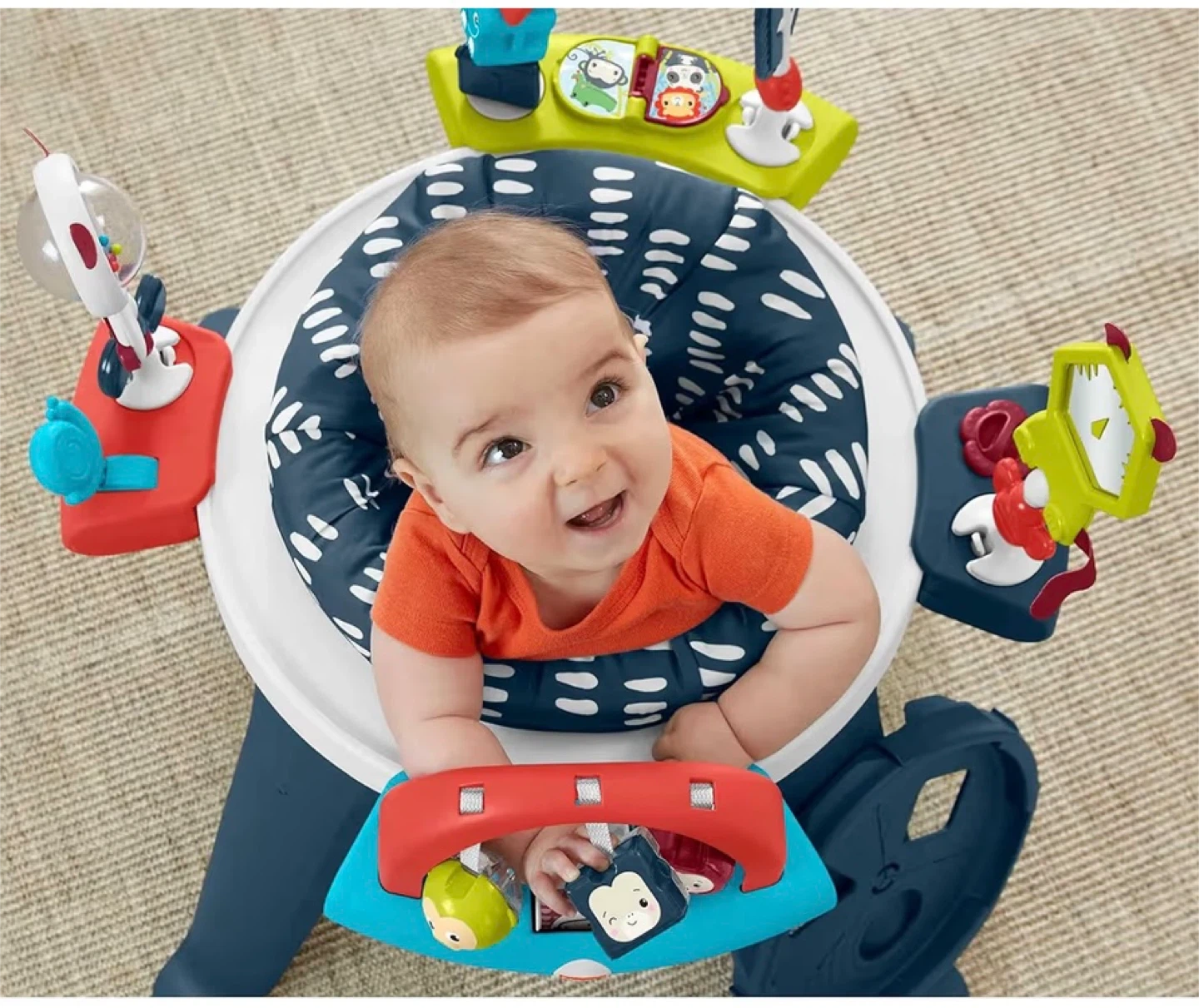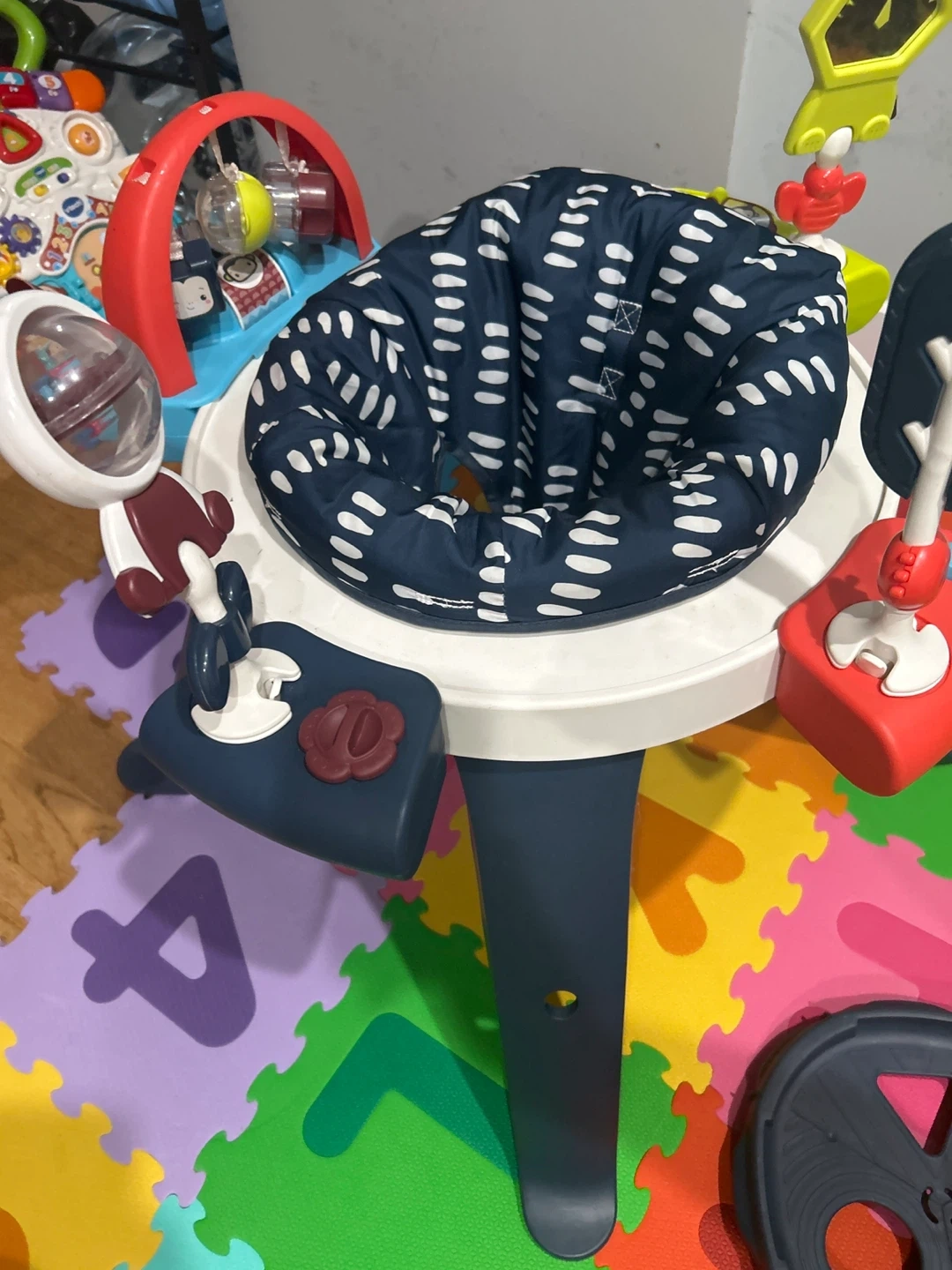 This Fisher-Price activity center features a 360-degree seat with a spinning play experience. It includes multiple toys and activities for baby's development. The seat pad is machine washable. Recommended for babies up to 25 lbs.