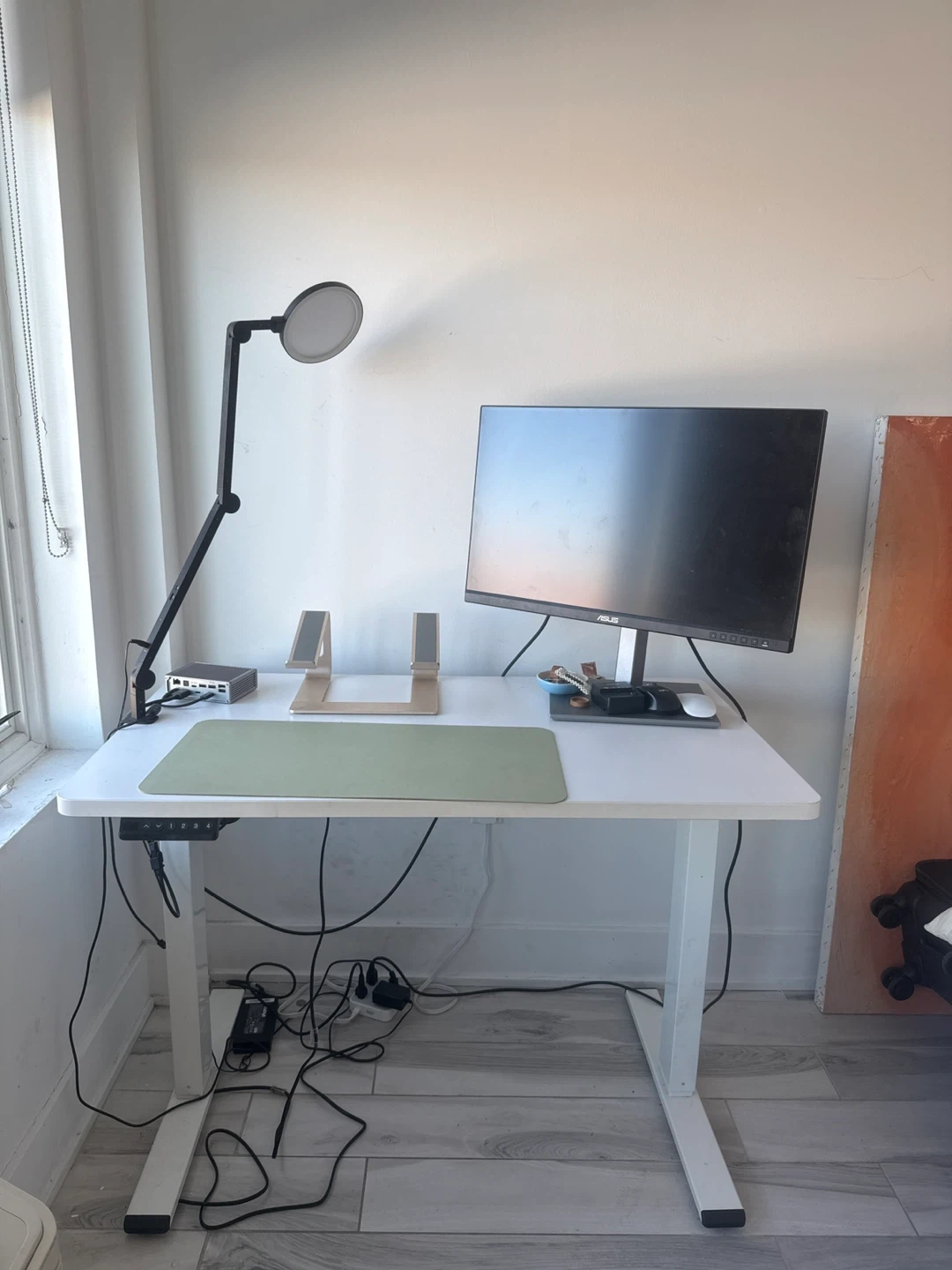This is a white standing desk with adjustable height. It has a spacious work surface for your computer and accessories. The desk features electric height adjustment with a control panel. Great for small spaces.