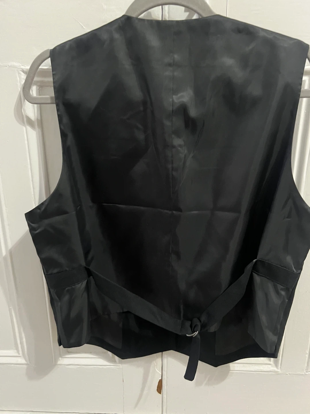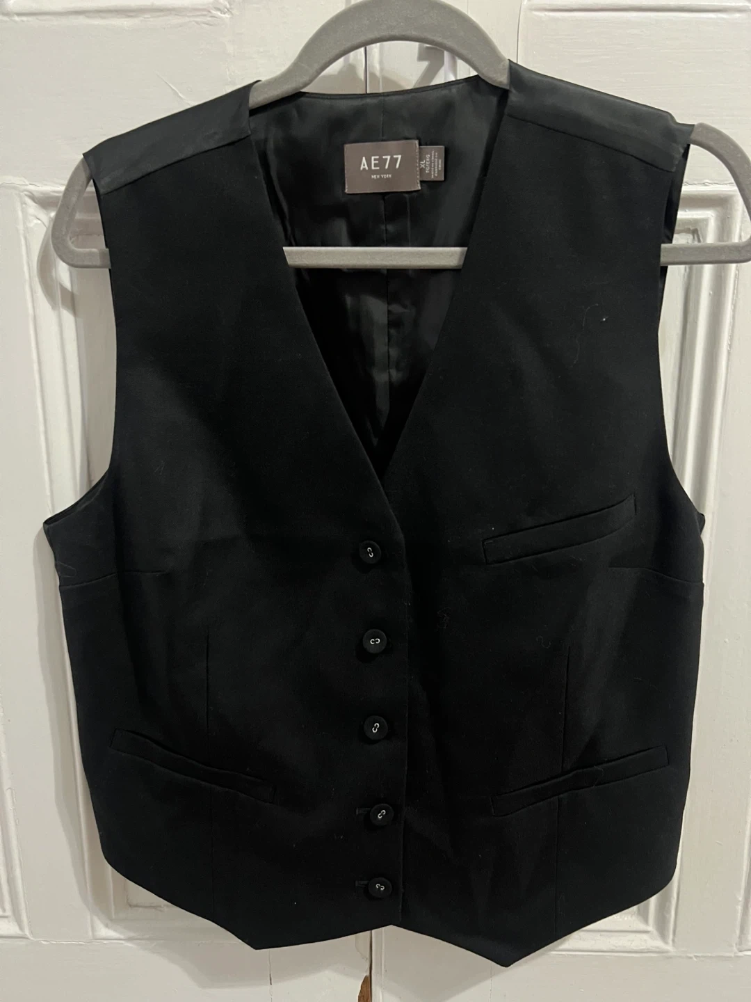 This is an AE77 New York black vest. It's a classic V-neck style with button closure. Features adjustable strap on the satin like back. Never worn but no tags.