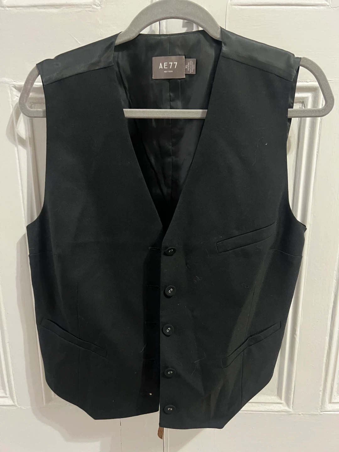 This is an AE77 New York black vest. It's a classic V-neck style with button closure. Features adjustable strap on the satin like back. Never worn but no tags.