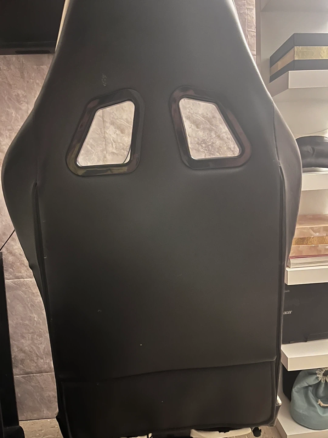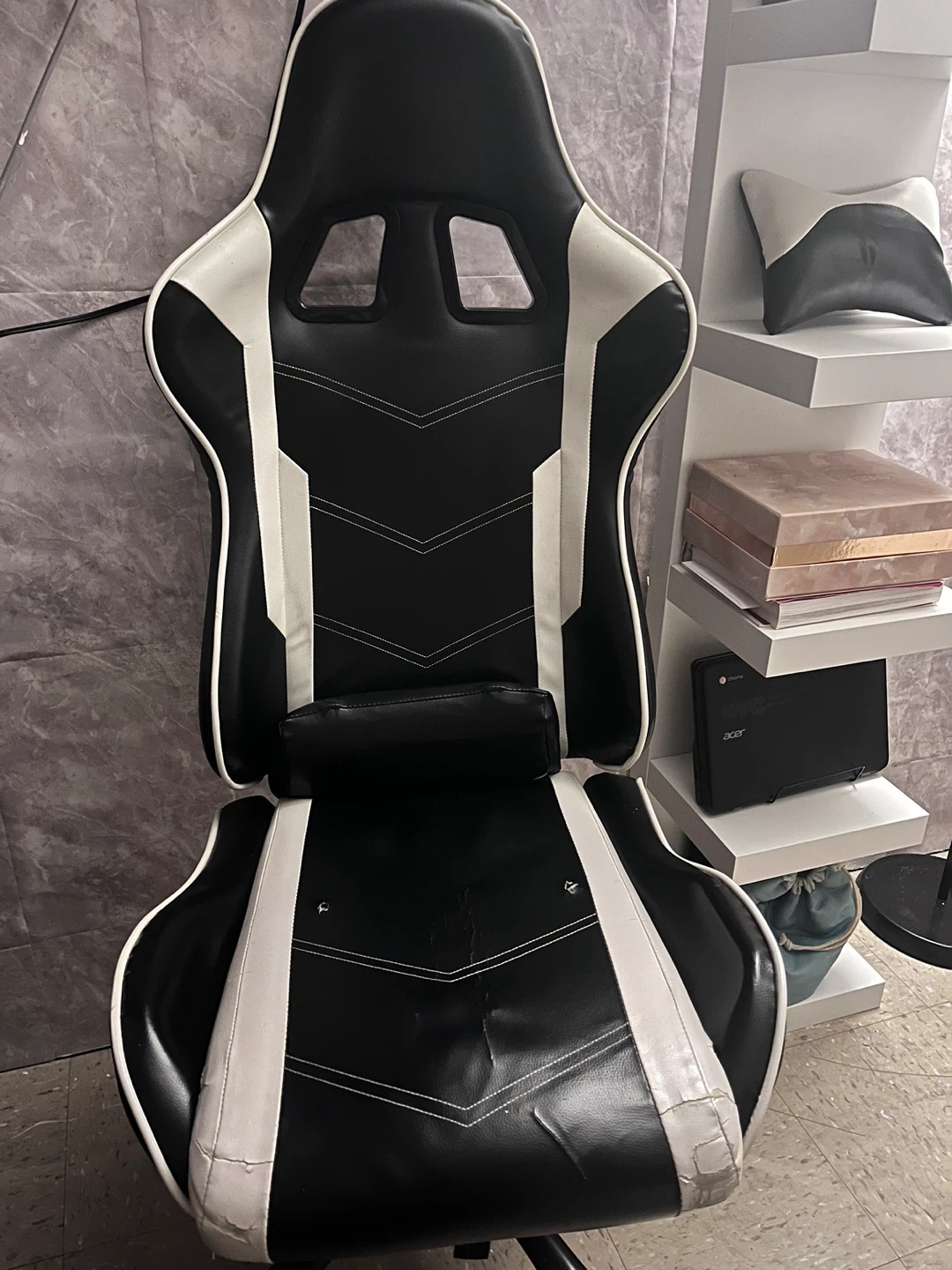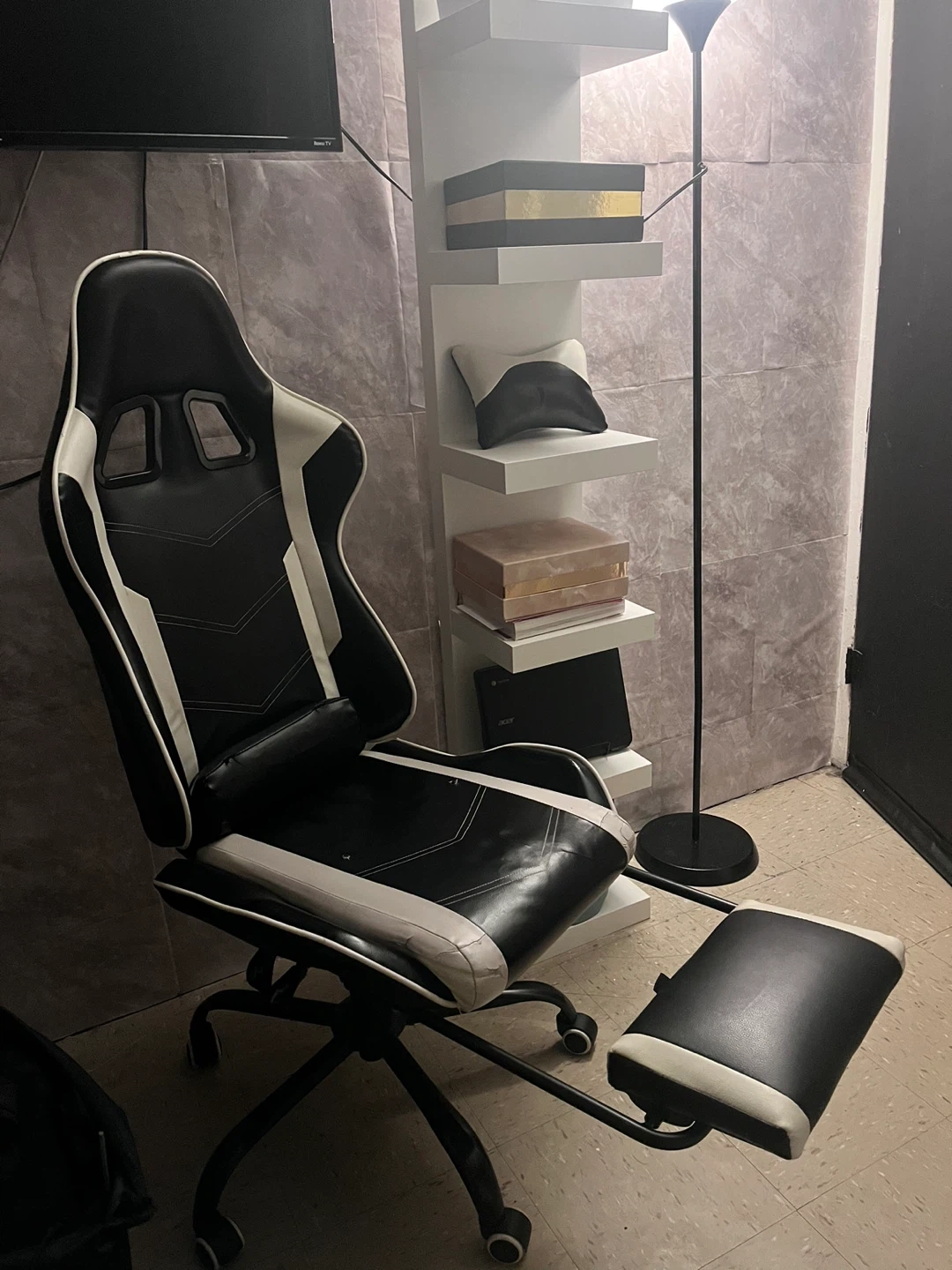 This black and white racing-style gaming chair offers a comfortable seating experience. It's made with faux leather and includes a retractable footrest. Some wear is visible on the seat.