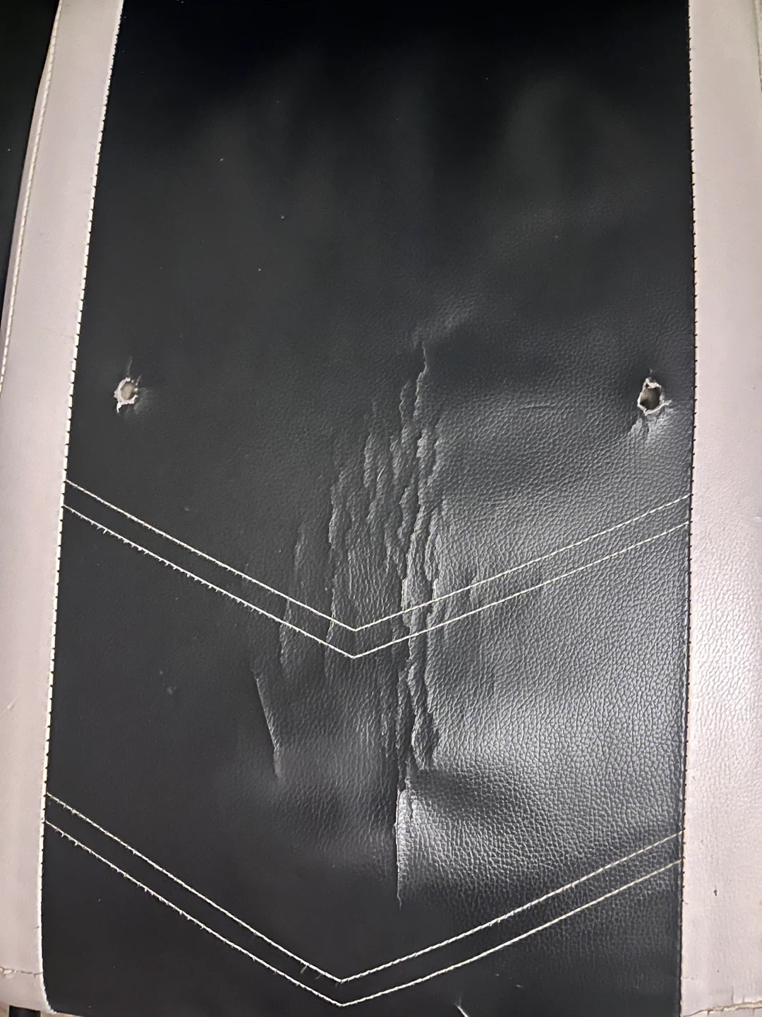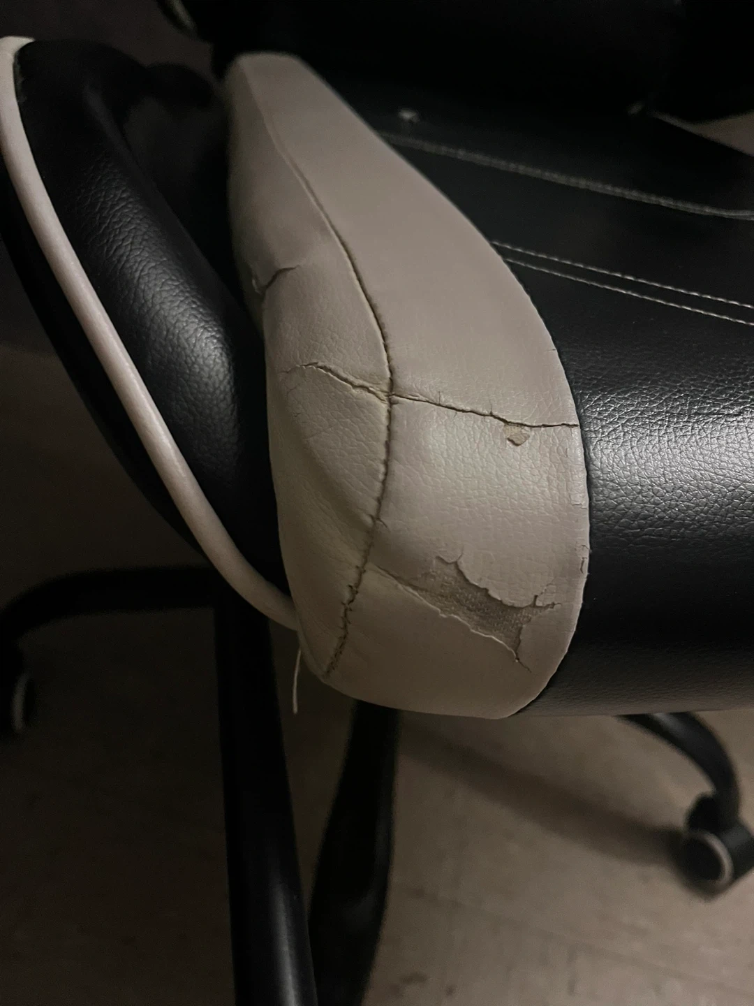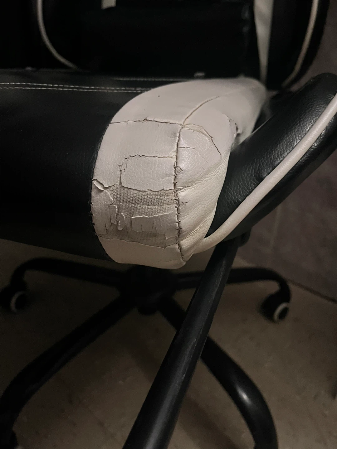 This black and white racing-style gaming chair offers a comfortable seating experience. It's made with faux leather and includes a retractable footrest. Some wear is visible on the seat.