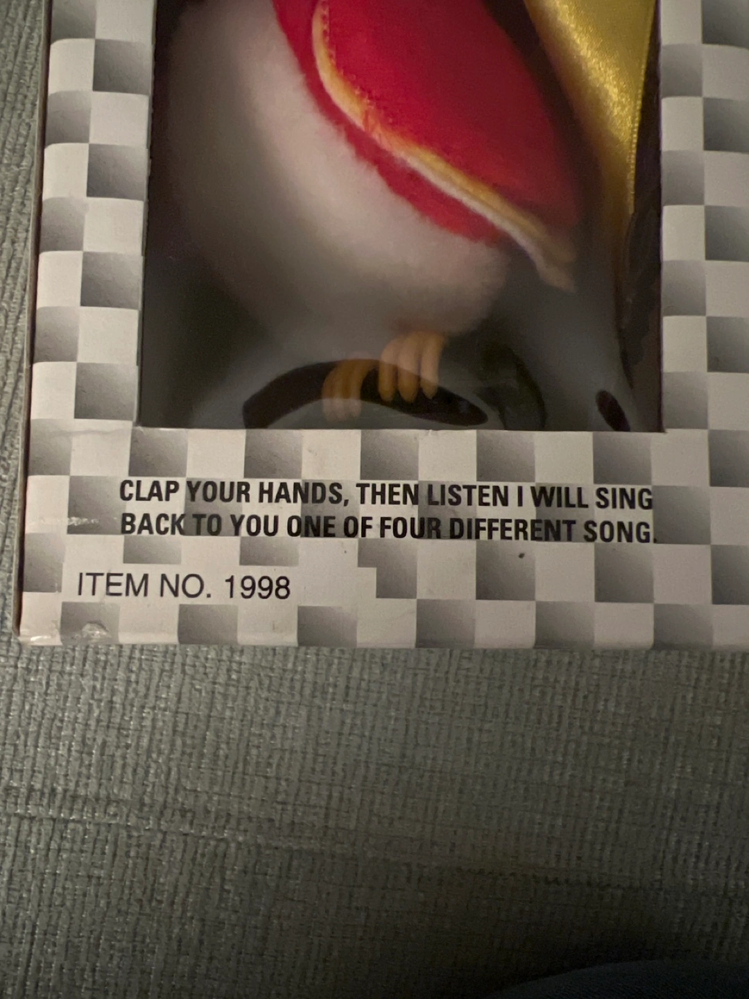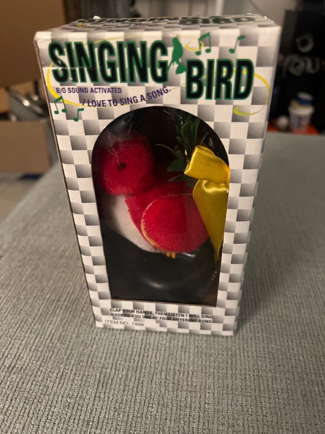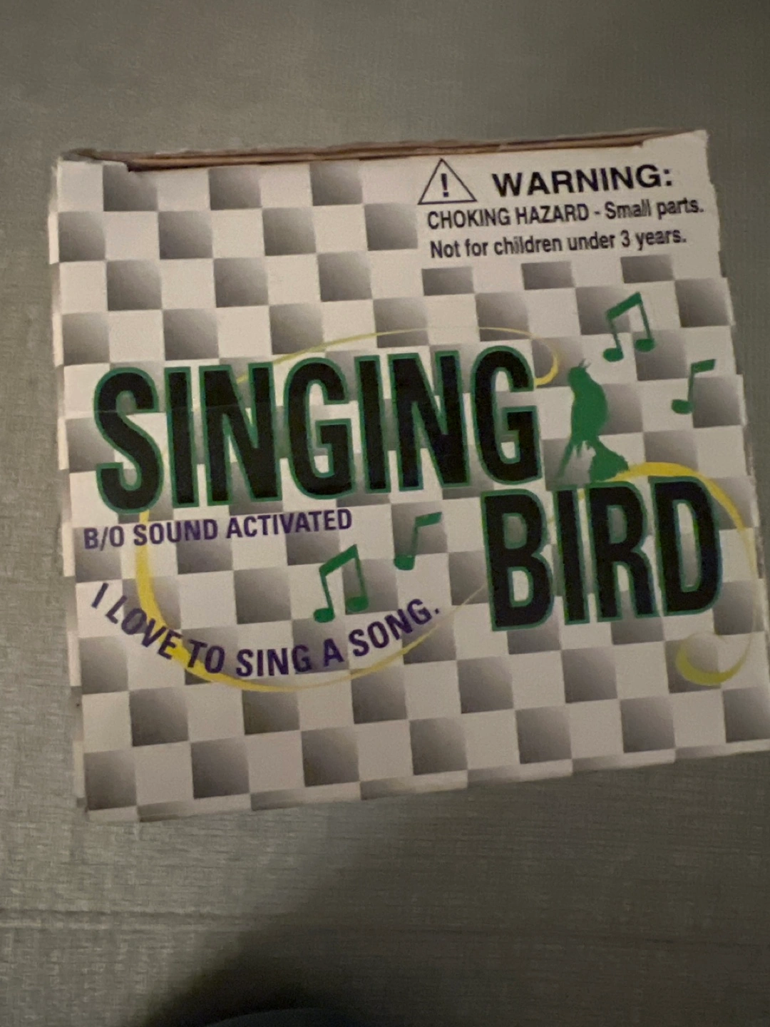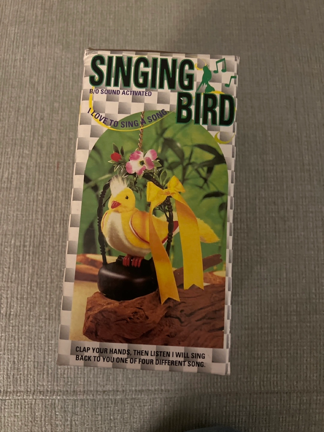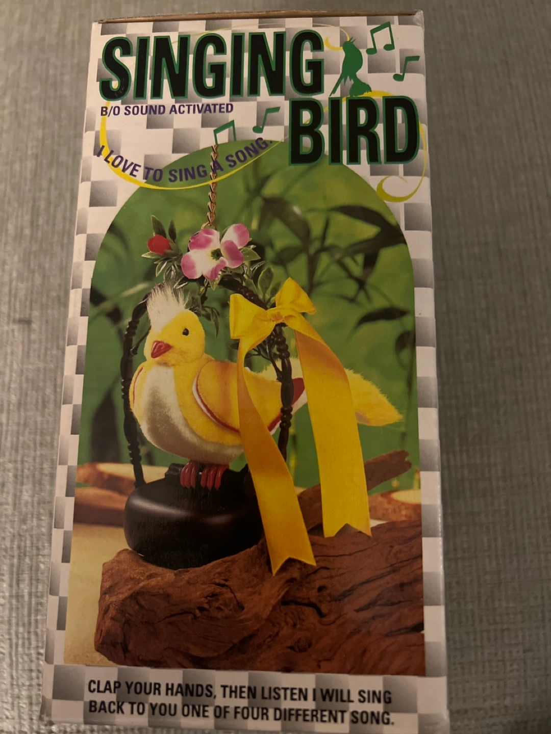 Vintage sound activated singing bird toy. Clap your hands, the bird sings one of four songs. Requires 2 AA batteries (not included). Item No. 1998. Choking hazard, not for children under 3.