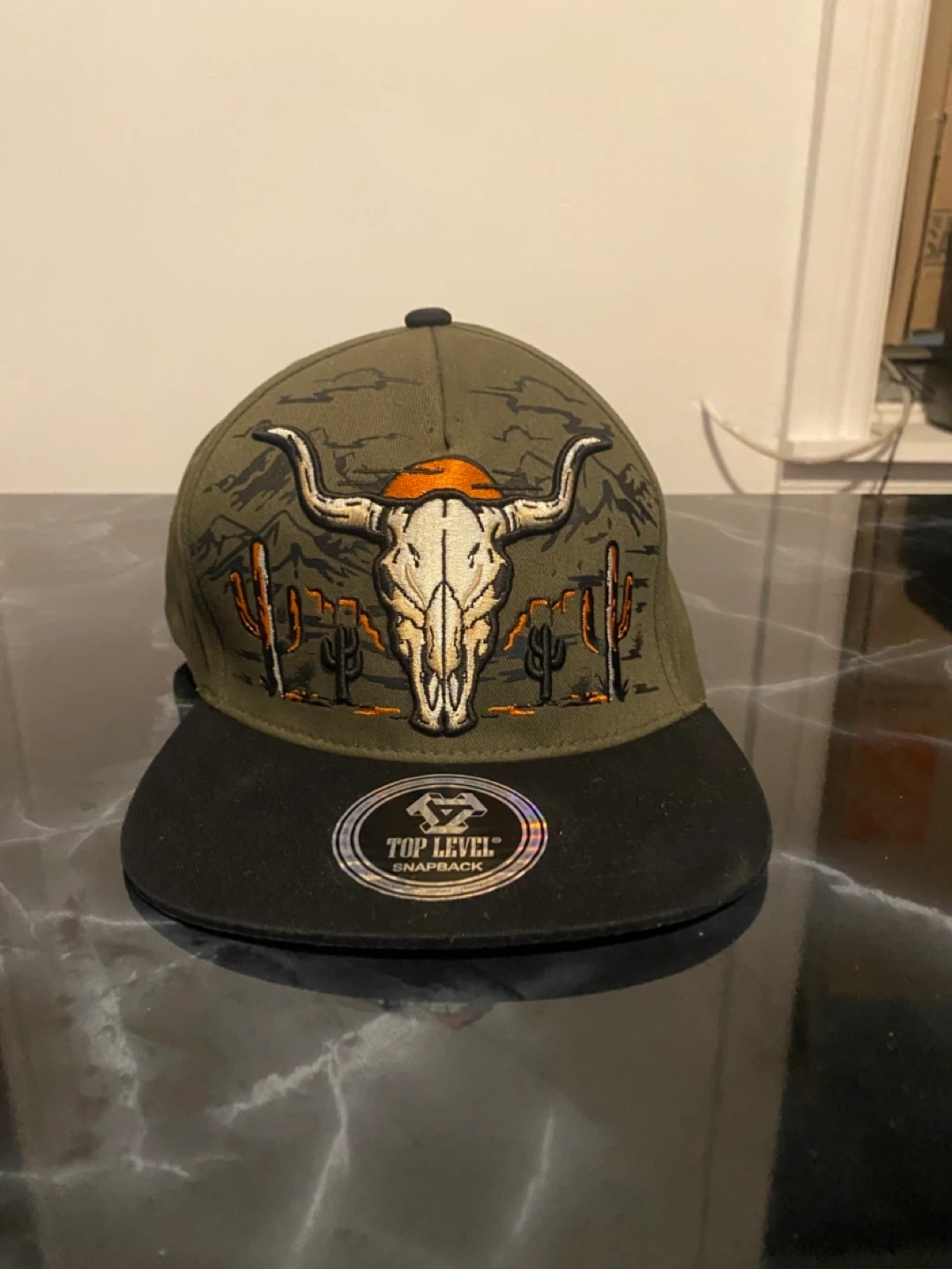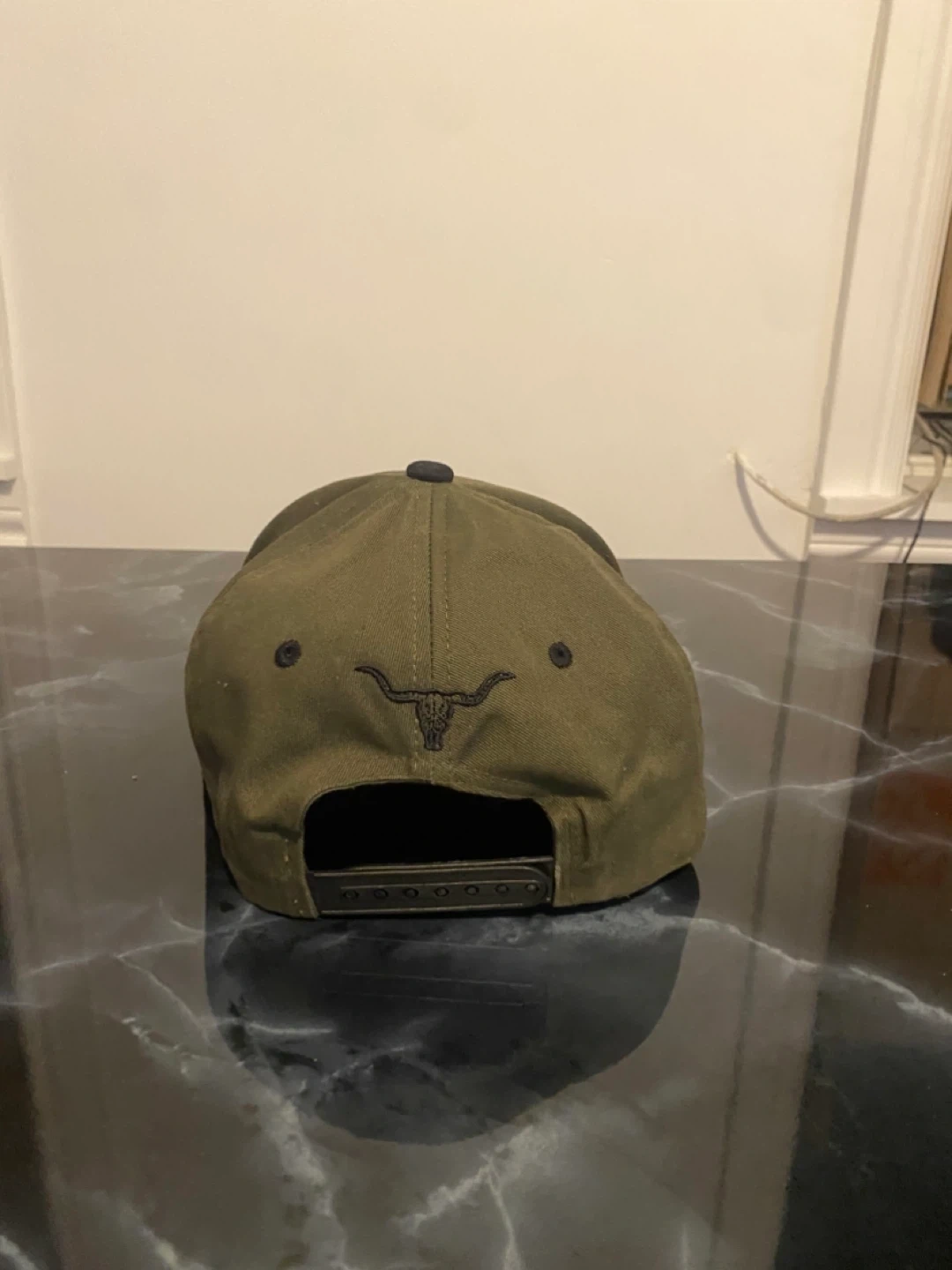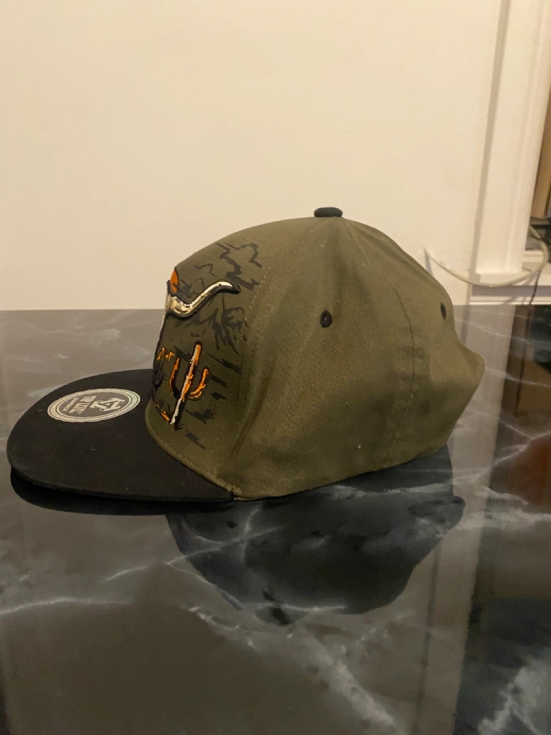 This is a green and black snapback hat with a Western theme design. It features embroidered details and a flat brim. The hat is adjustable for a comfortable fit. One size fits all.