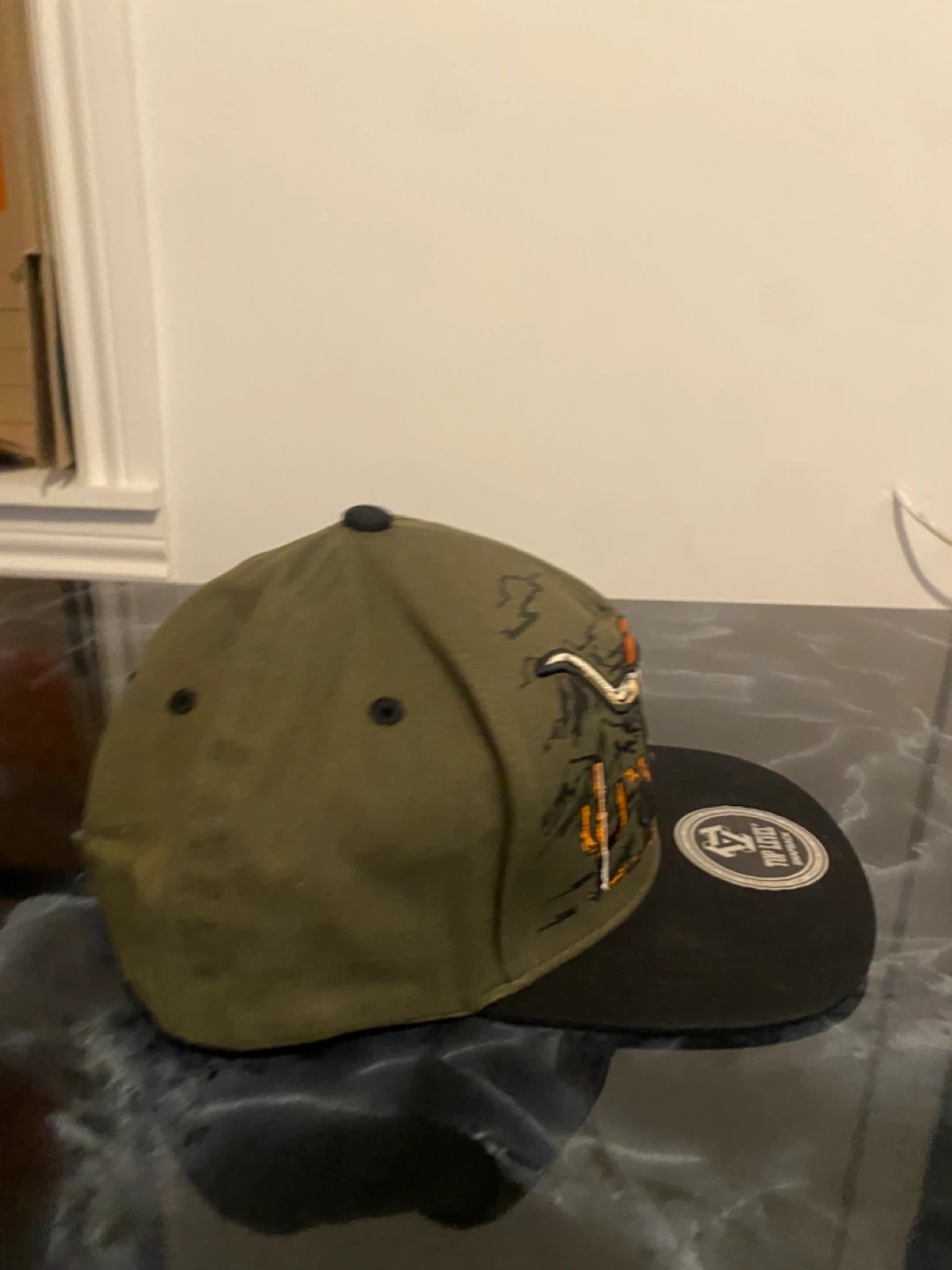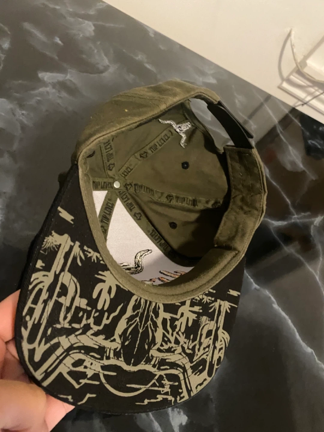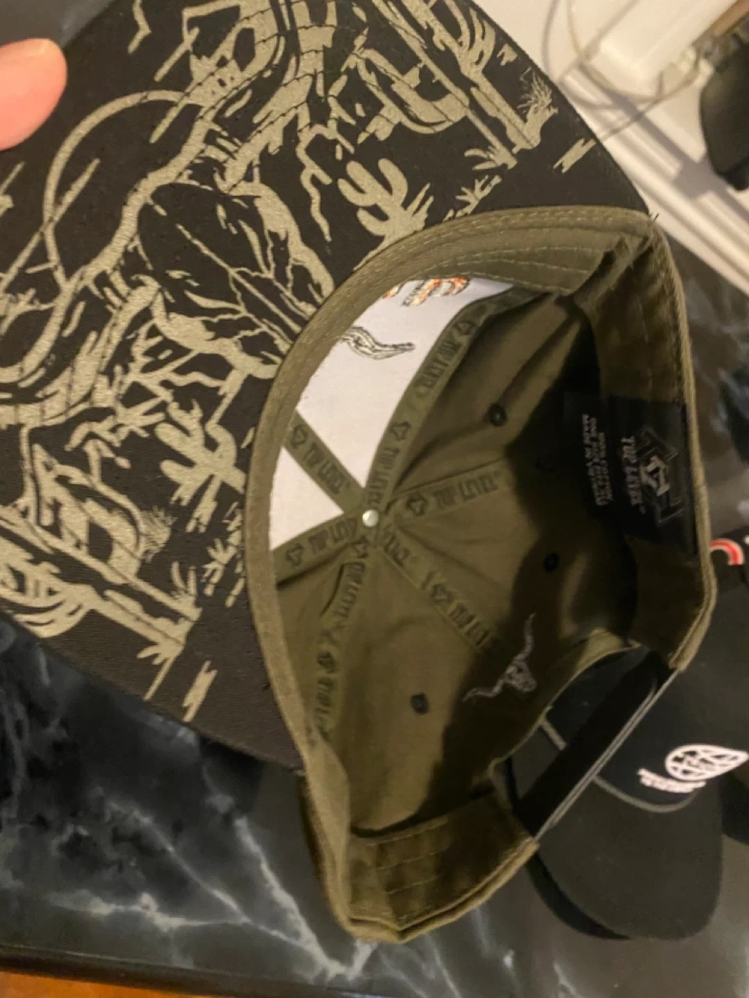 This is a green and black snapback hat with a Western theme design. It features embroidered details and a flat brim. The hat is adjustable for a comfortable fit. One size fits all.