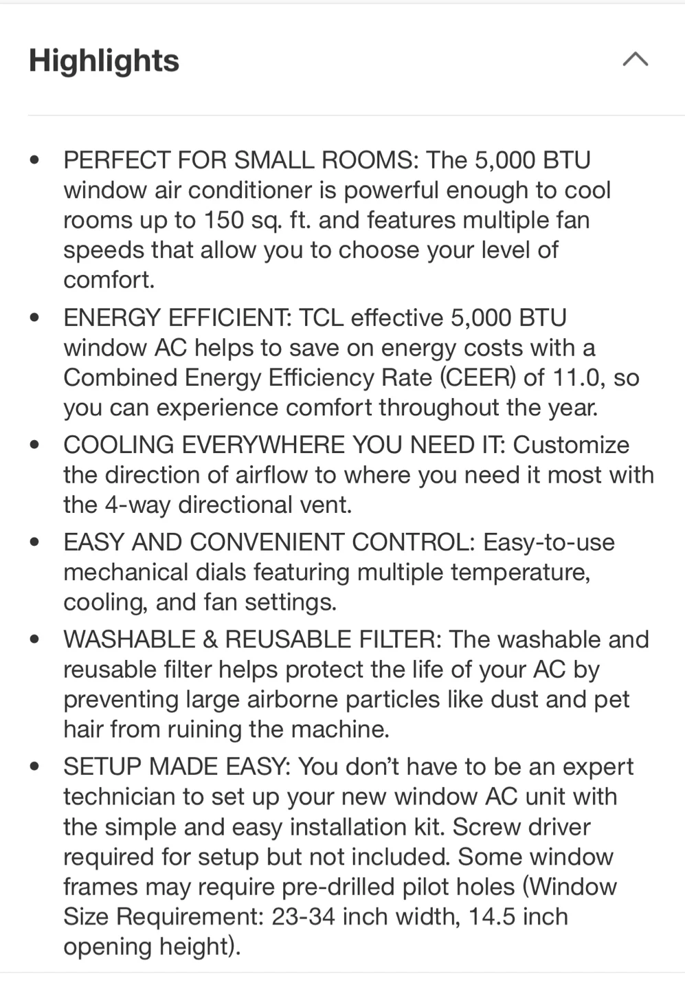 TCL 5000 BTU window air conditioner with a reusable filter. It's compact and designed for spaces. Kept our bedroom cool in the summer months! Only bought last August. Features 2 speeds and runs on 115V with a 6ft cord. The unit's filter is easily removable for cleaning. I have attached all other info from the original target listing where we bought it :)