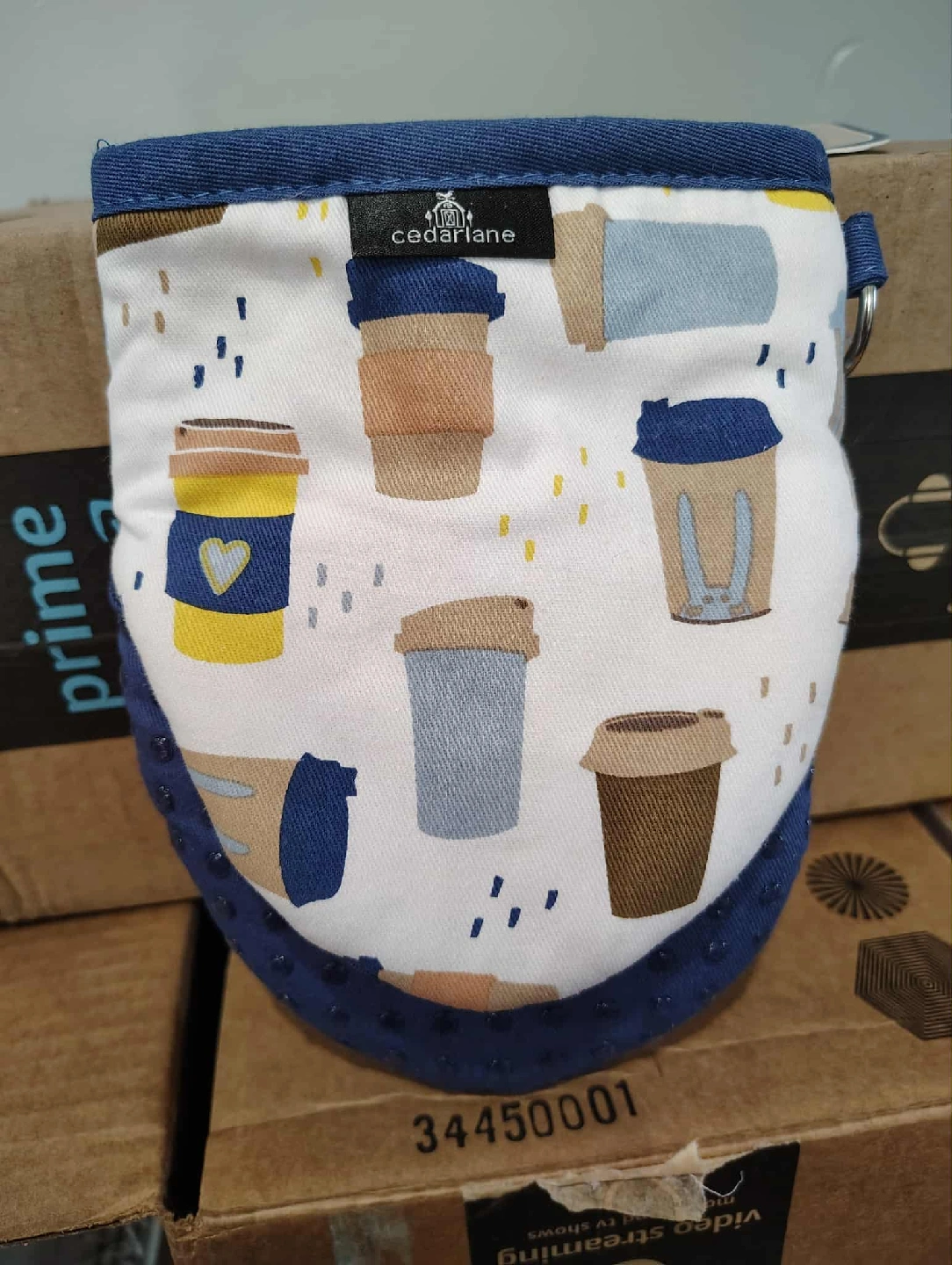 Here's a Cedar Lane oven mitt featuring a cute coffee cup print! It has a blue trim and a convenient loop for hanging. Perfect for adding a touch of charm to your kitchen!