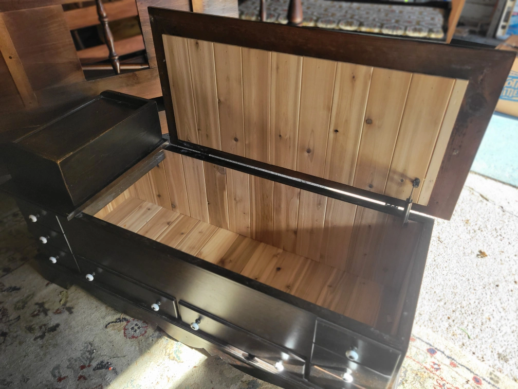 90This is a cedar lined chest, perfect for storing blankets or other items. It has a dark finish and white knobs on the drawers. The inside is lined with cedar wood.47.5"W x 24"H x 18"D.. has a shelf that can be used for books, phones, tablets etc. Cash only. Must pickup in Elgin.