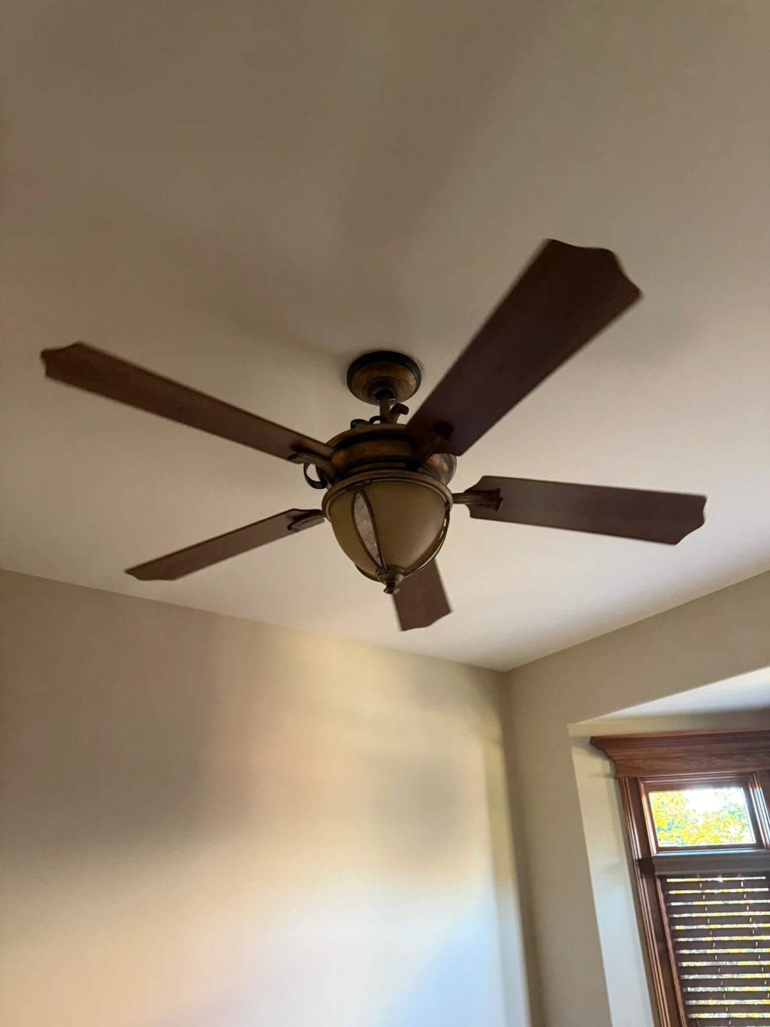 62Selling a used ceiling fan. It has five blades and a light fixture in the center. Great for any room!