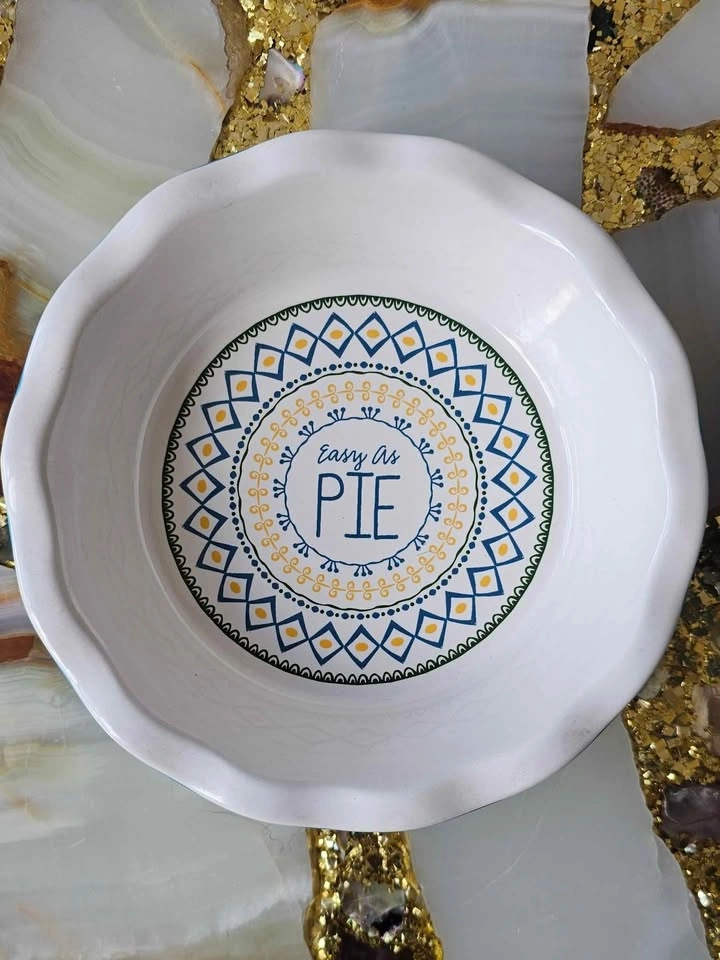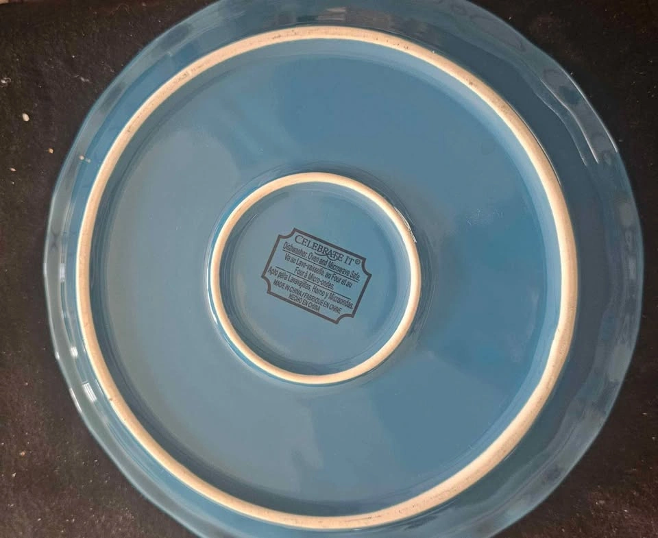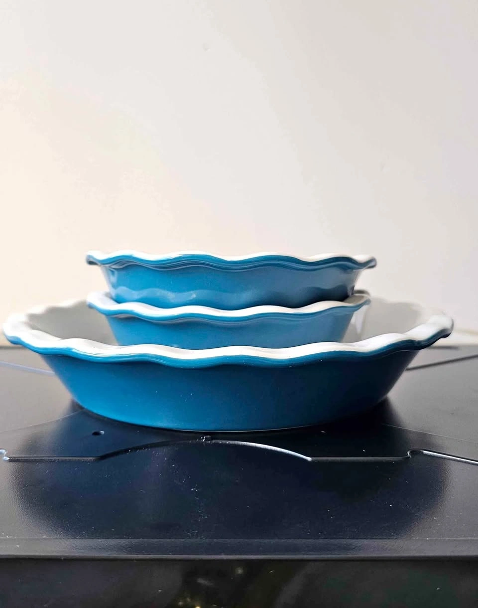 10The "Celebrate It" 3-Piece Ceramic Turquoise Scalloped Pie Set includes three round pie dishes. These oven-safe and dishwasher-safe ceramic pie plates are perfect for baking and serving your favorite pies. The large pie dish is 8.5" and the two small ones are 6" diameter.