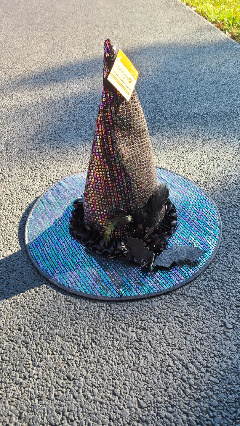 Get ready for Halloween with this fun witch hat from Celebrate It! It features a sparkly, sequined design with black feather and bat accents. Originally priced at $19.99, this hat is sure to add some spooky flair to your costume