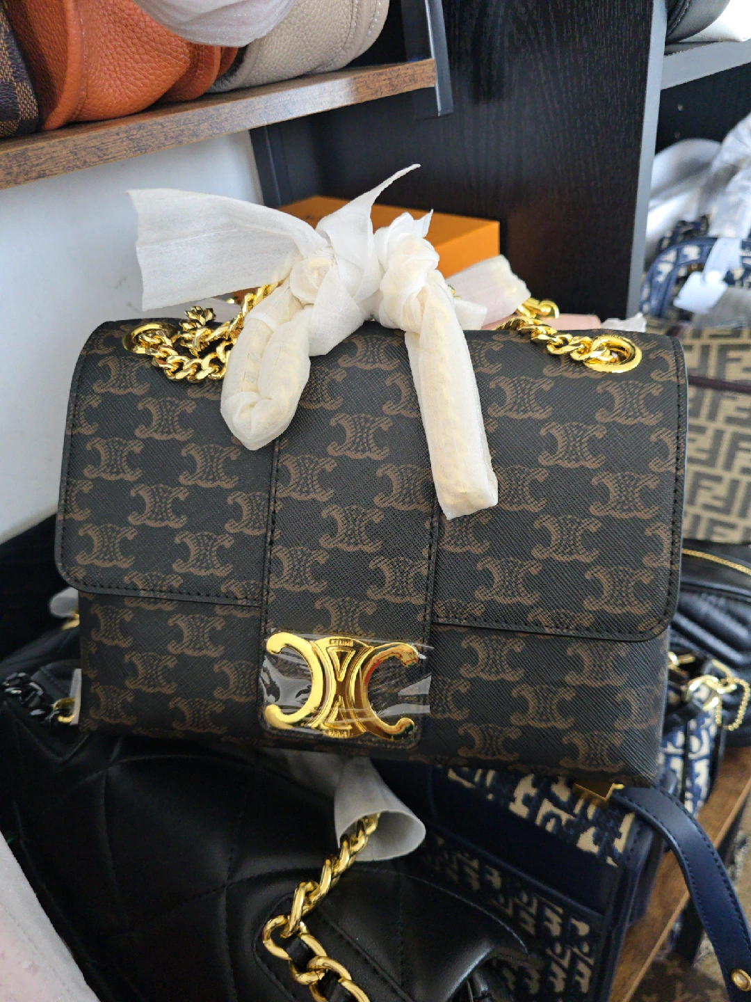 Selling a Celine chain shoulder bag. It features the classic Celine monogram pattern and a gold chain strap. The bag is in great condition and ready for a new owner! Perfect for adding a touch of luxury to any outfit