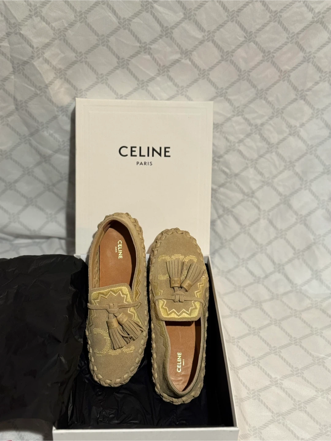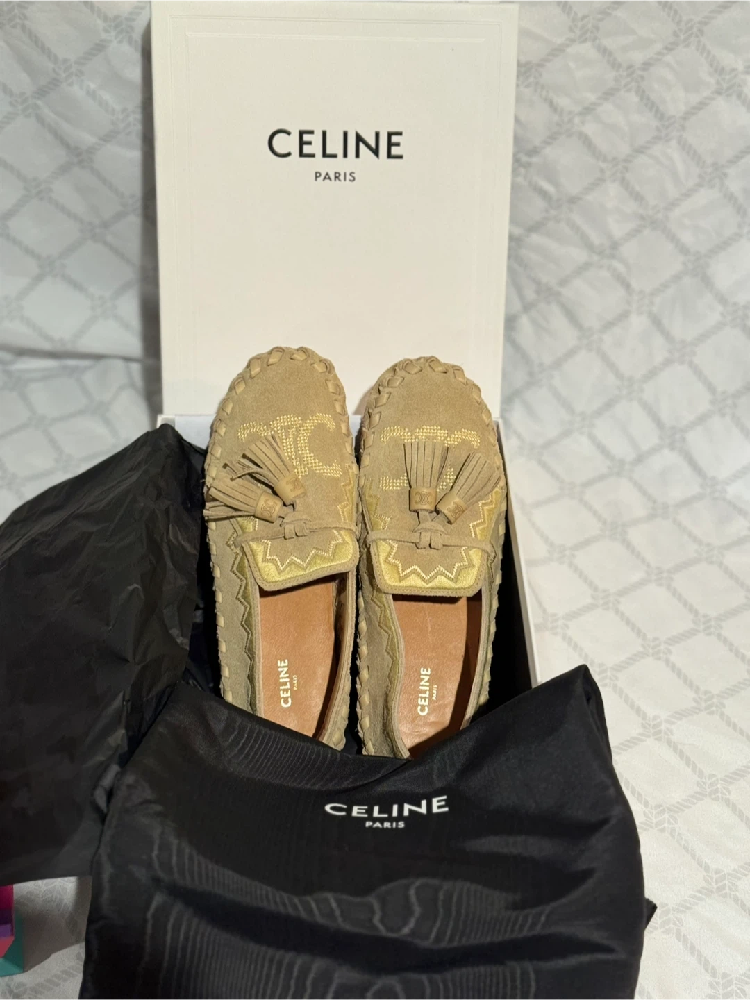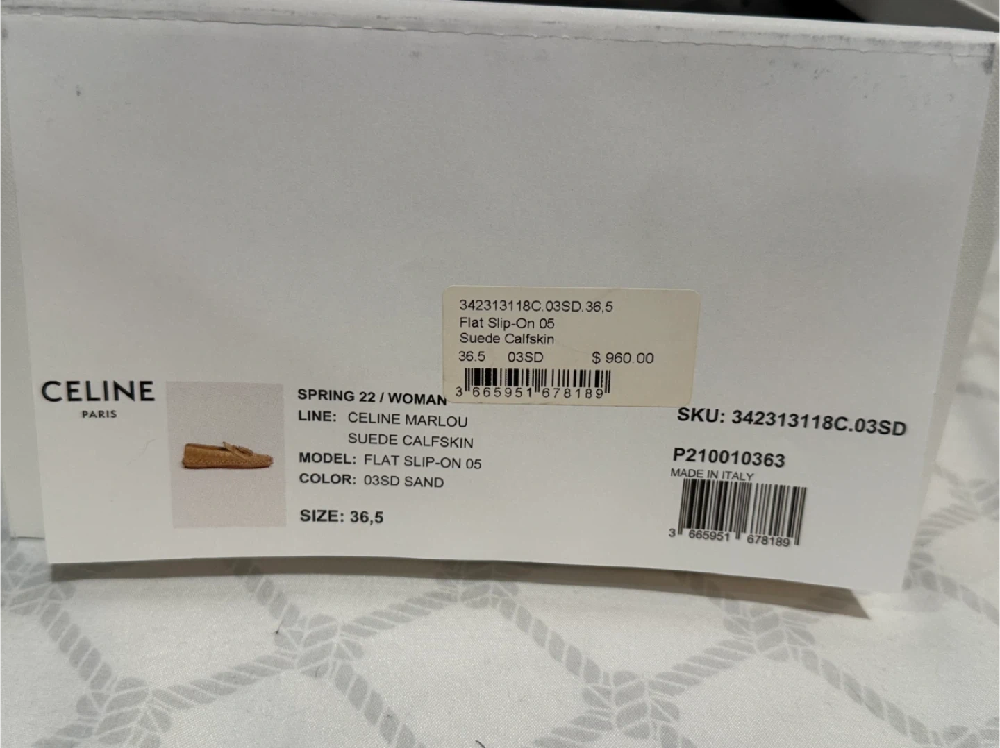 5Selling a pair of Celine Flat Slip-On loafers in size 6.5. These stylish slip-ons are made from suede calfskin and come in the 03SD sand color. Originally bought for $960, they are in excellent condition and come with the original box
