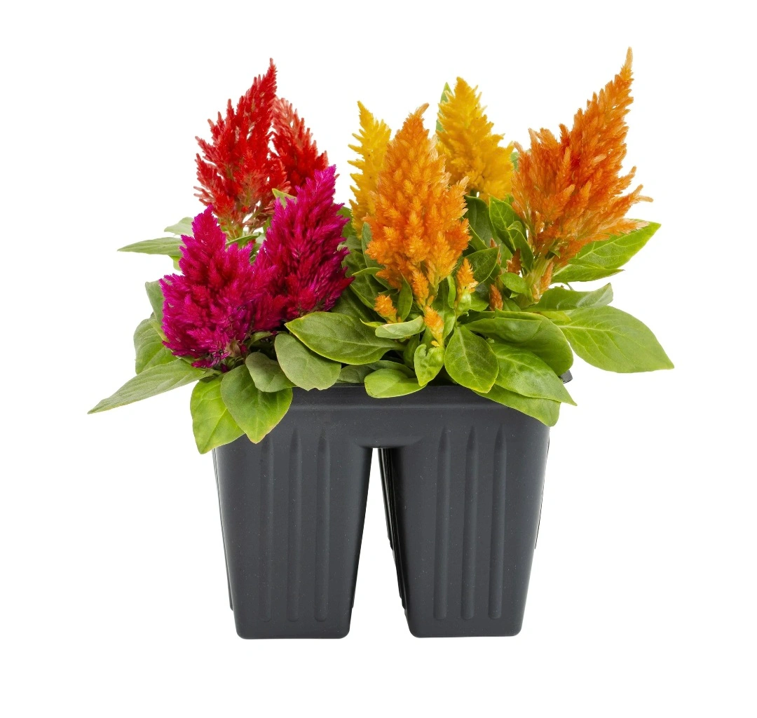 Three vibrant celosia plants in a black plastic pot. Red, orange, and yellow flowers. Perfect for adding a pop of color to your garden.