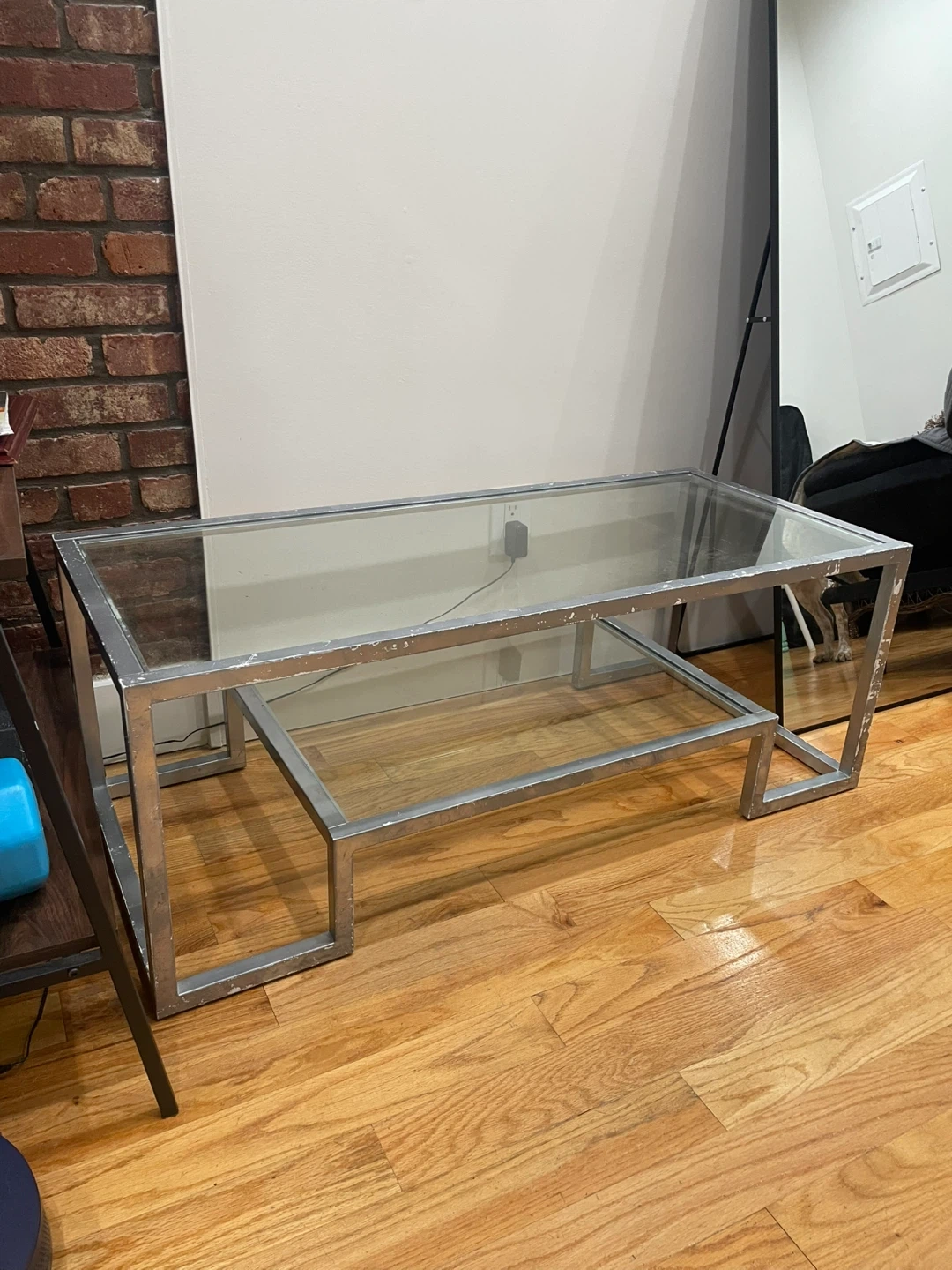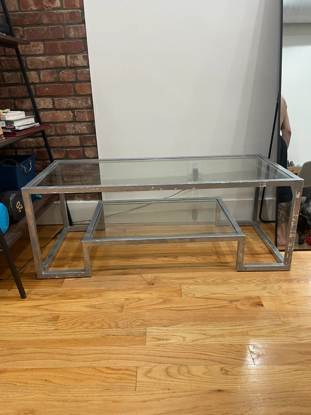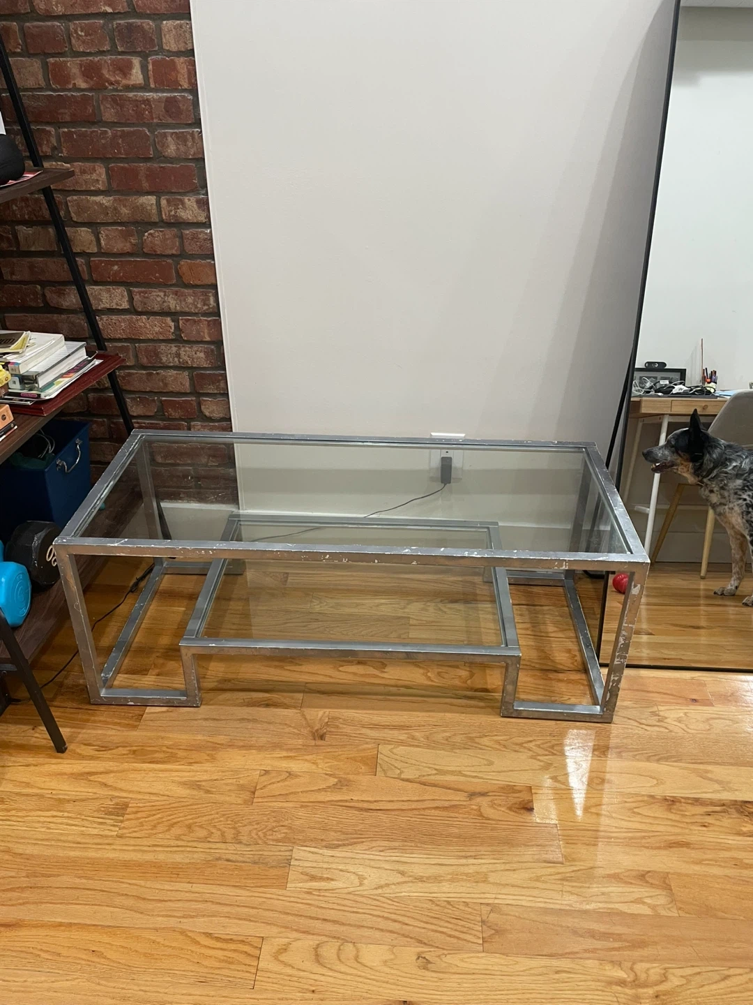 24Glass center table. The frame is not heavy at all. Both glasses in perfect condition. One paint or spray and its like new. Moved to a smaller space so cant use it no more but I love it with my heart!!!