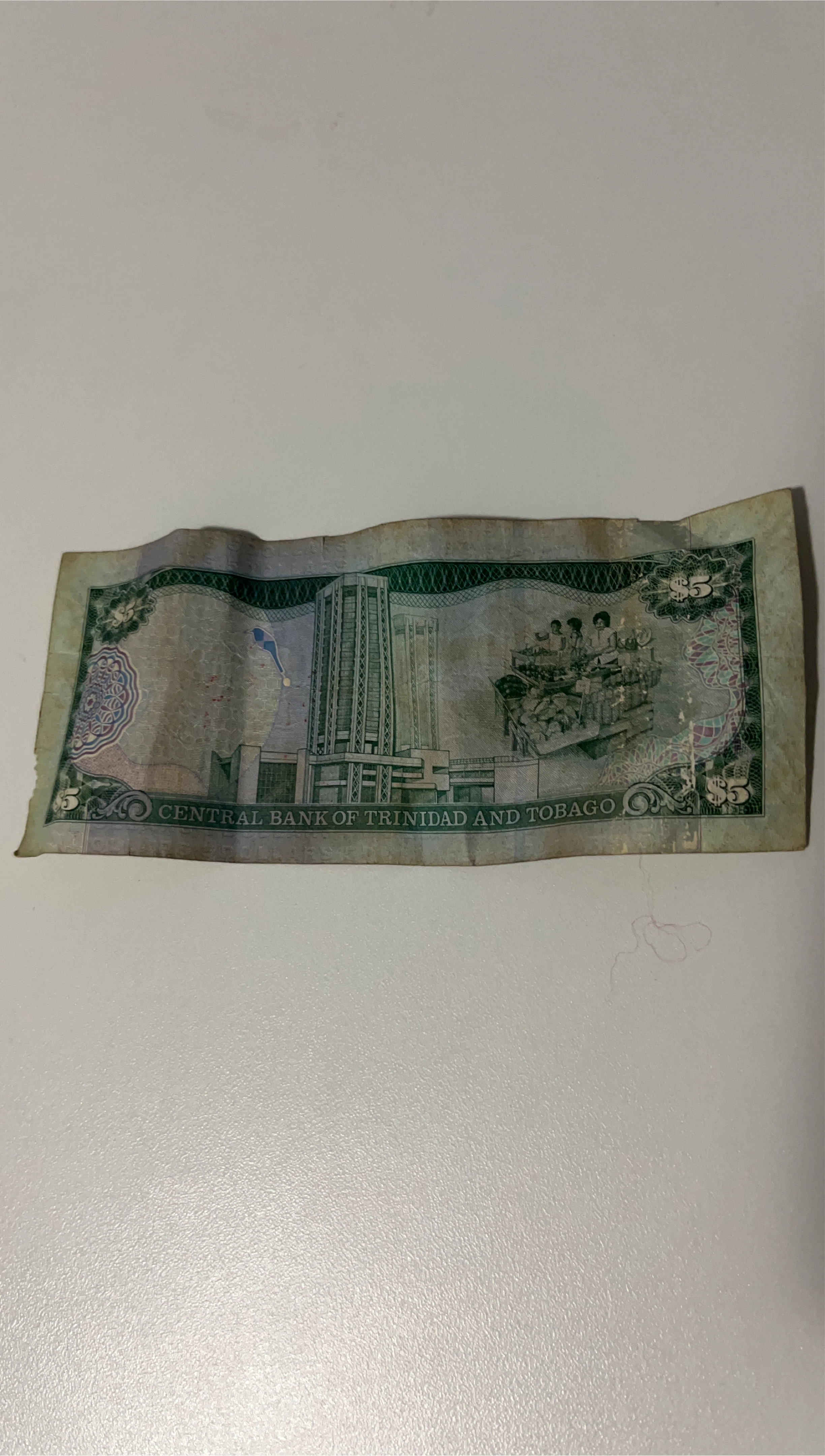 Selling a Central Bank of Trinidad and Tobago $5 bill. It has some wear and tear, but it's still a cool piece of currency!
