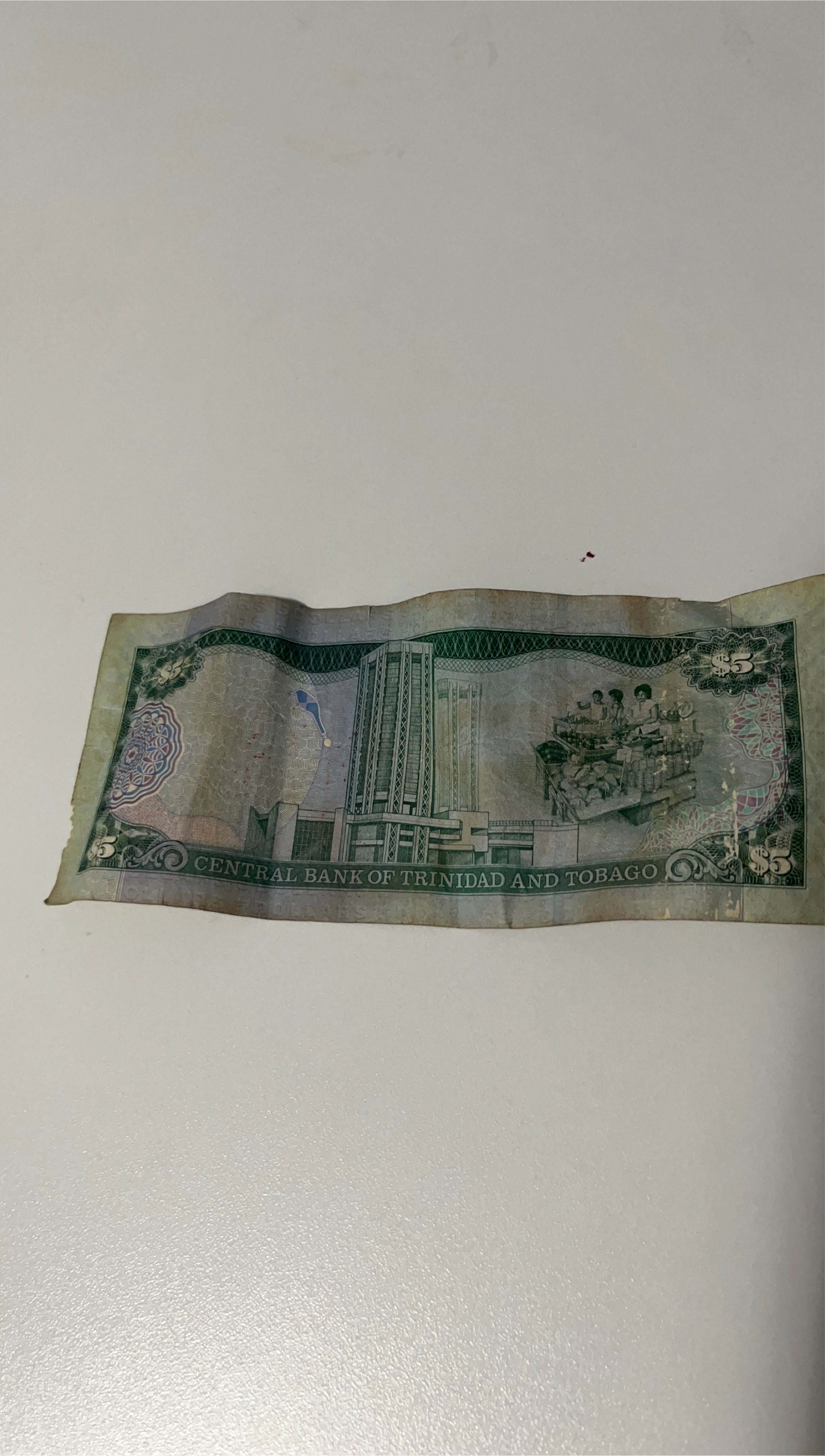 Selling a Central Bank of Trinidad and Tobago $5 bill. It features a building and people on it.