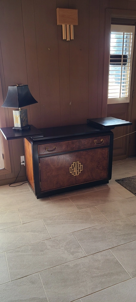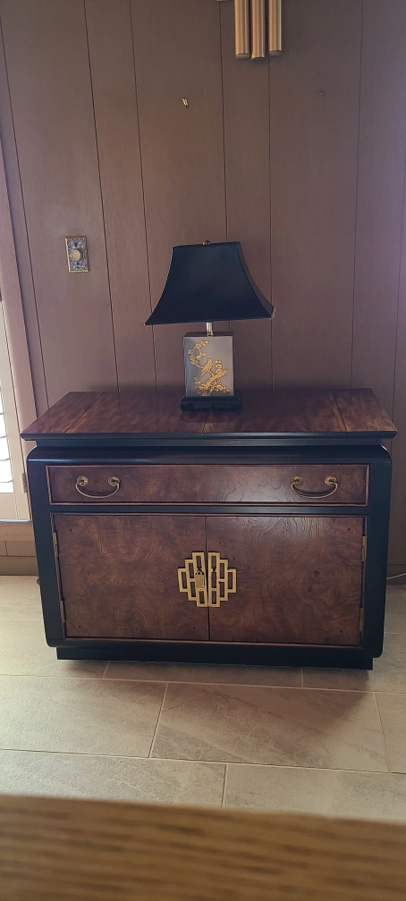 Selling a vintage Asian-style cabinet. It features a unique design with a dark wood finish and brass hardware. The cabinet has a drawer and doors for storage. It would make a great addition to any room! On wheels 40"w x 19"d x 29.5"h When top is extended it measure approximately 5'