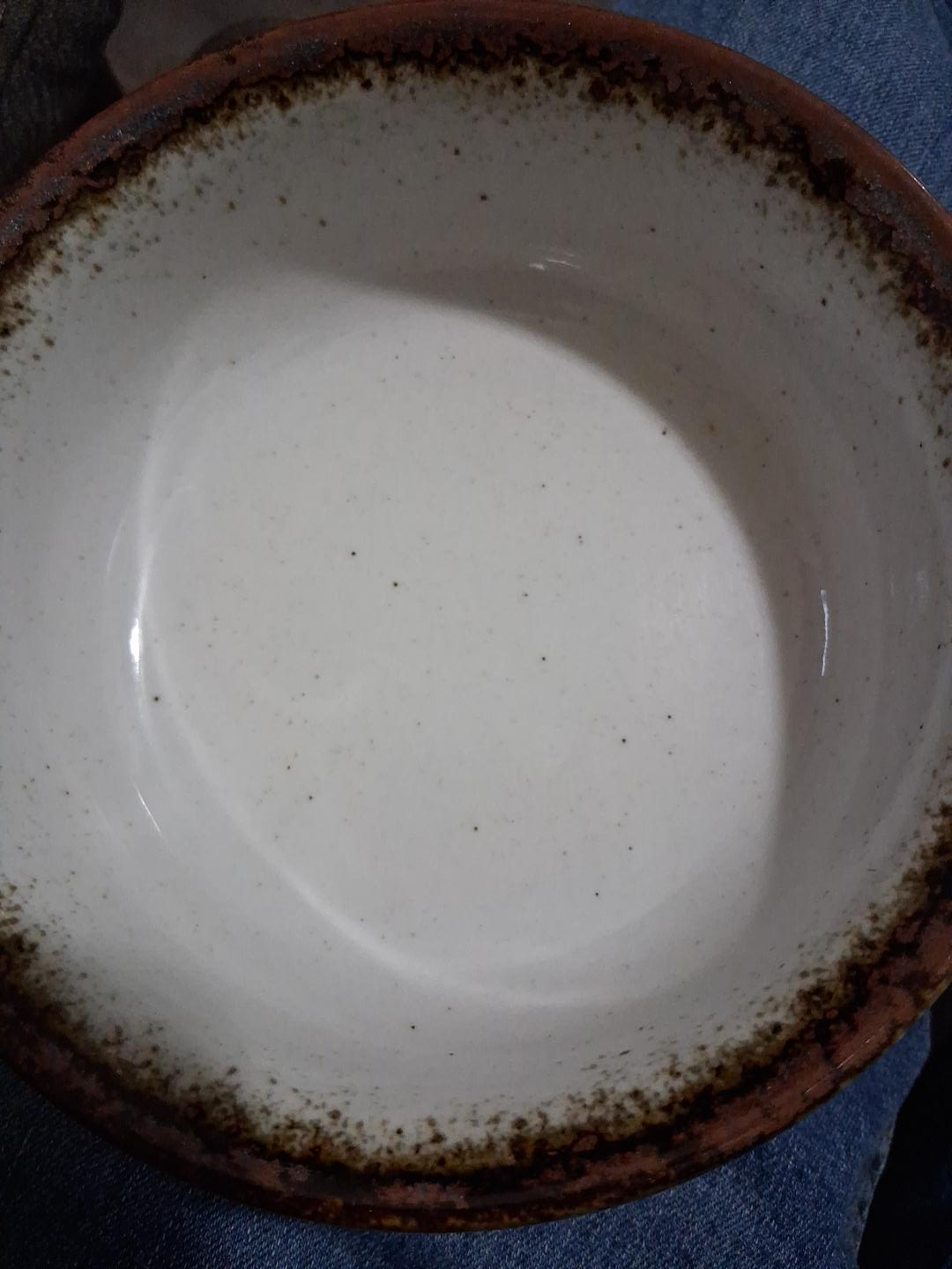 Selling a ceramic bowl with a unique brown rim. It's in good condition and ready for a new home! Would be perfect for soups, salads, or snacks