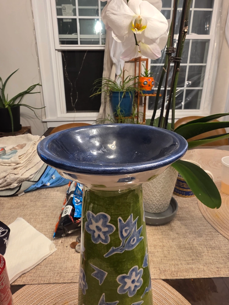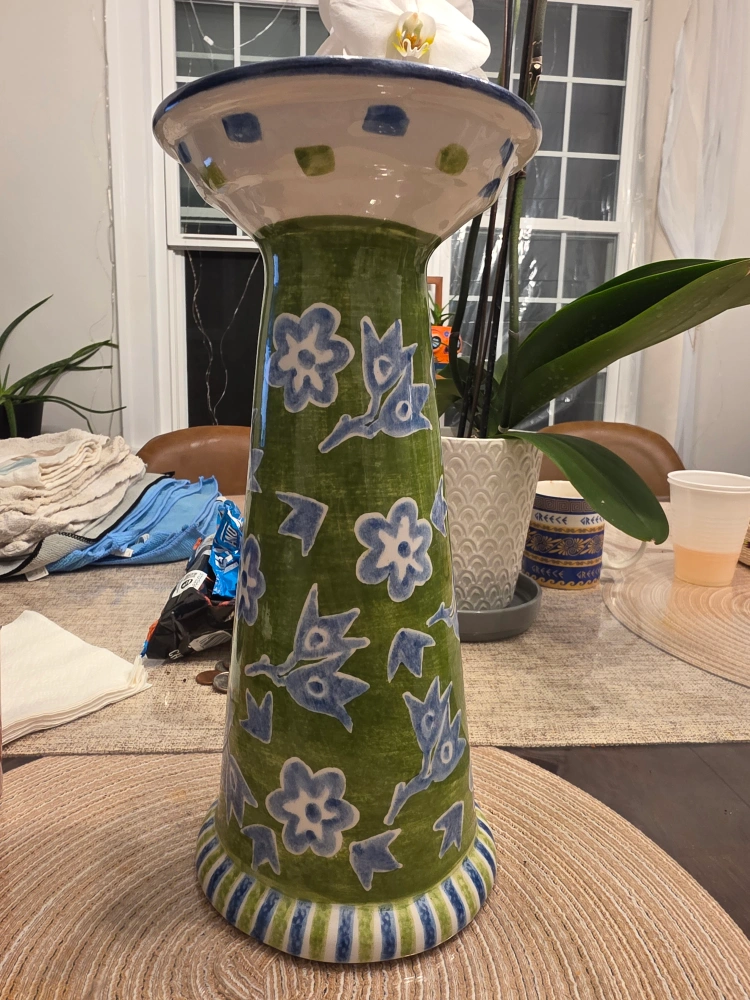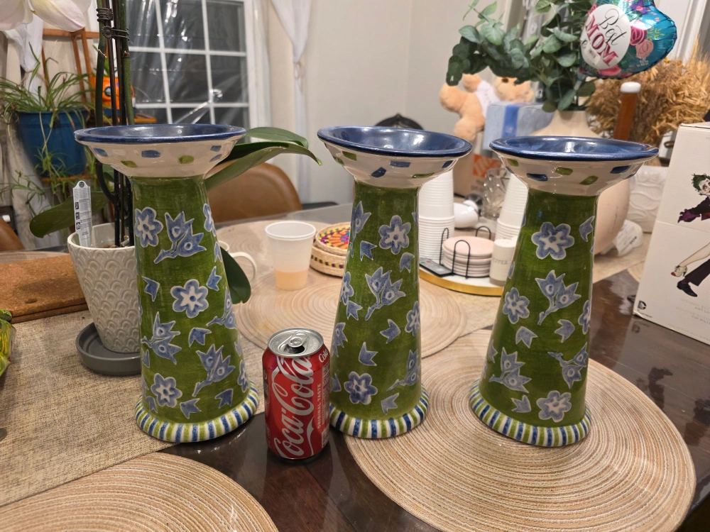 Offering a set of unique candle holders. They have a green base, with blue floral designs. The top and bottom have blue and white detailing. You can use these candle holders to create a warm atmosphere in your home or dining table center pieces. Items are all sold as a set of 3. You get all 3 bases