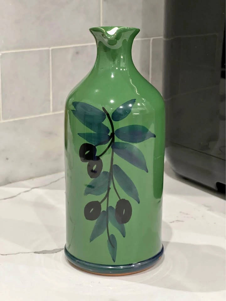 98This is a ceramic olive oil dispenser bottle with a hand-painted olive branch design. It is a type of cruet or bottle used for storing and pouring olive oil, featuring a hand-painted olive branch design. The opaque ceramic material helps protect the olive oil from light and heat, which can affect its quality. This style of olive oil dispenser is often referred to as a cruet or jug.