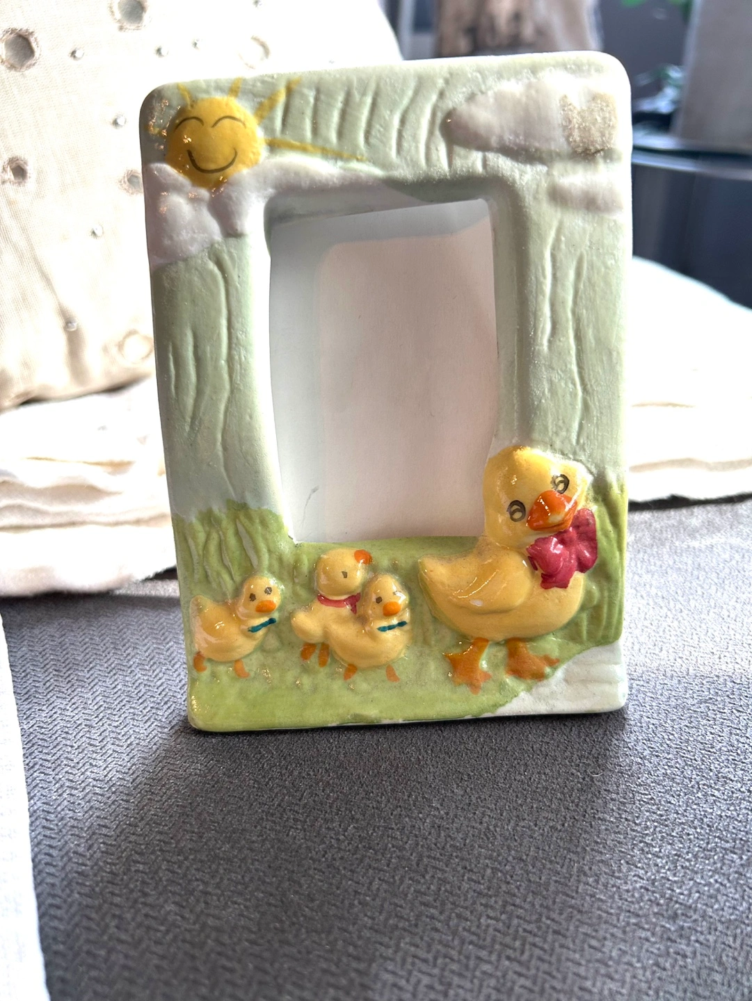 Ceramic picture frame. Green background with ducks and a sun.