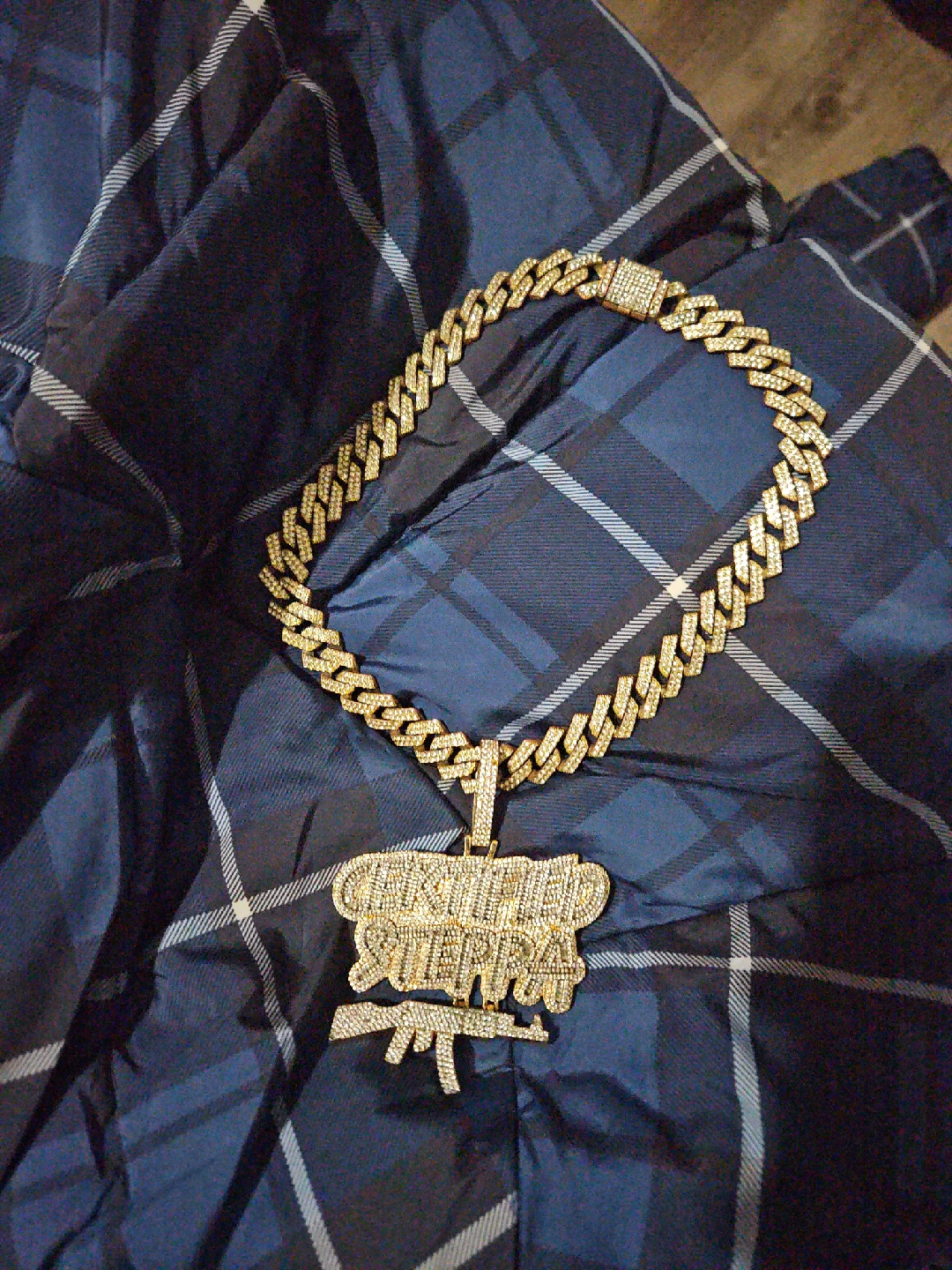 23Selling a gold chain with a 'Certified Steppa' pendant. The pendant also has a gun design on it. It's a beautiful statement piece! call me at 929-703-0128