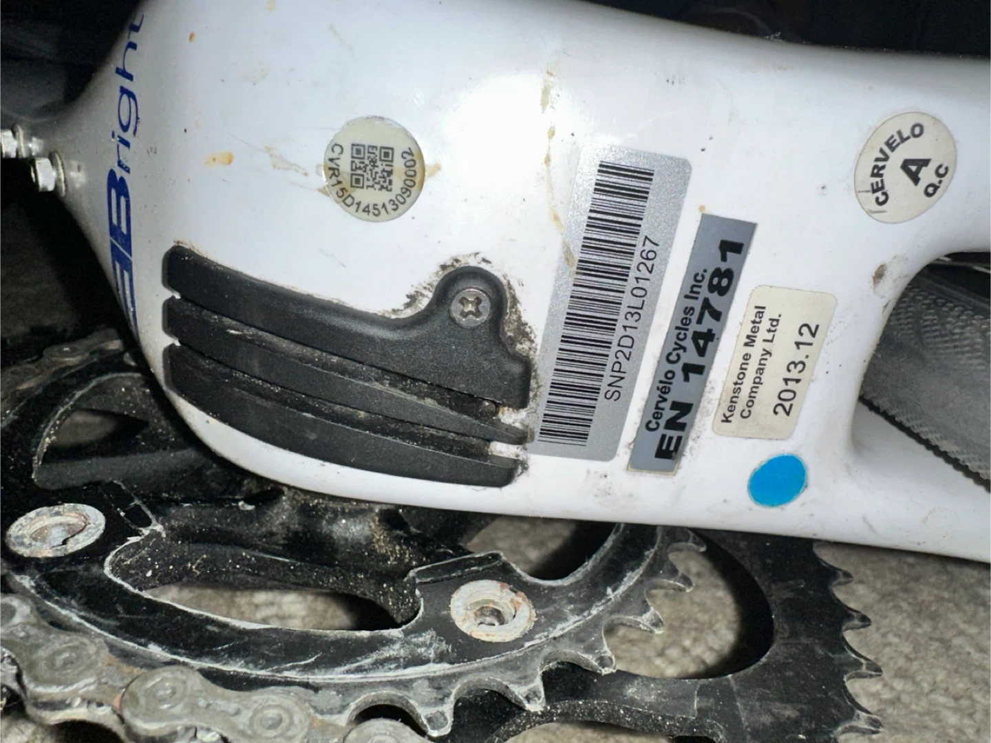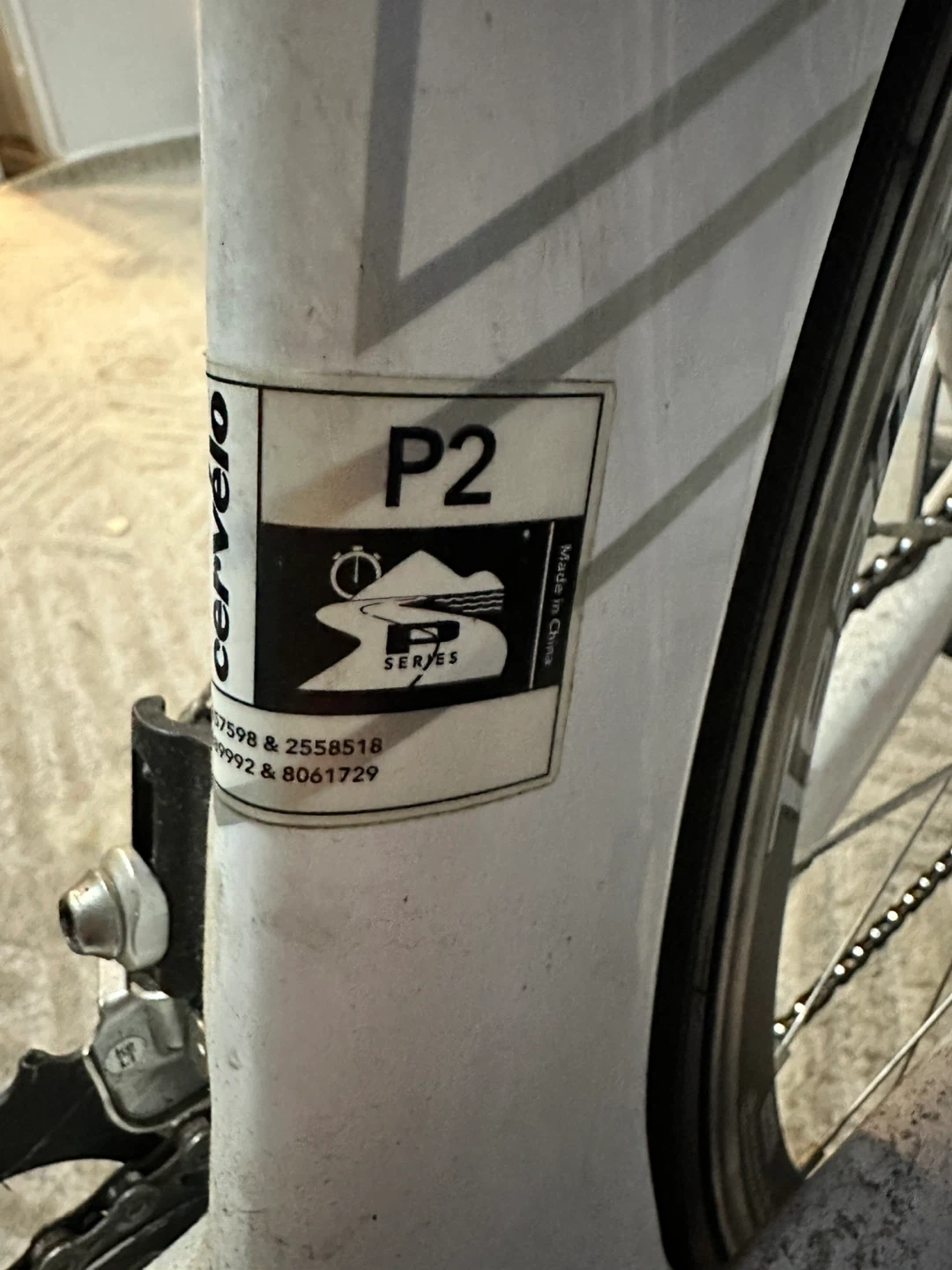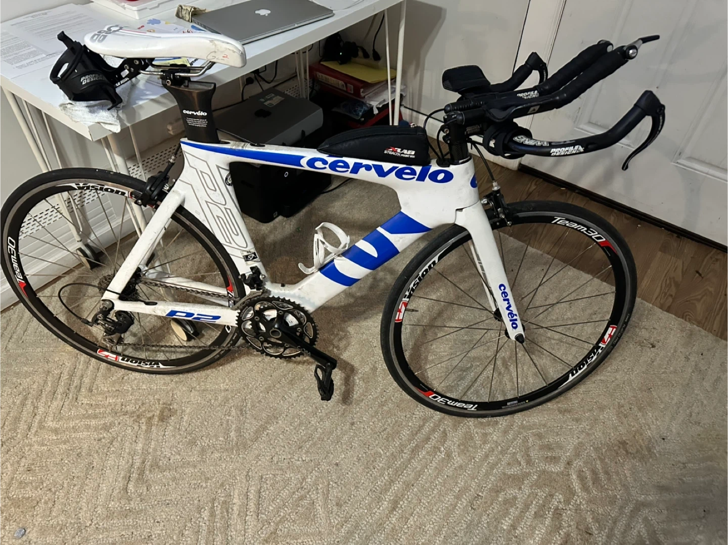 Selling a Cervelo P2 Series road bike, size 45. It has a Shimano 105 derailleur and Vittoria Rubino Pro tires. The bike is in used condition, but still has plenty of life left in it!