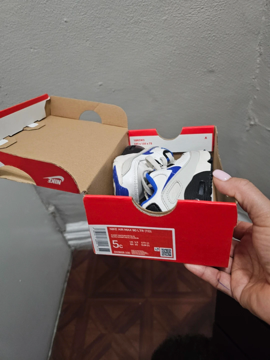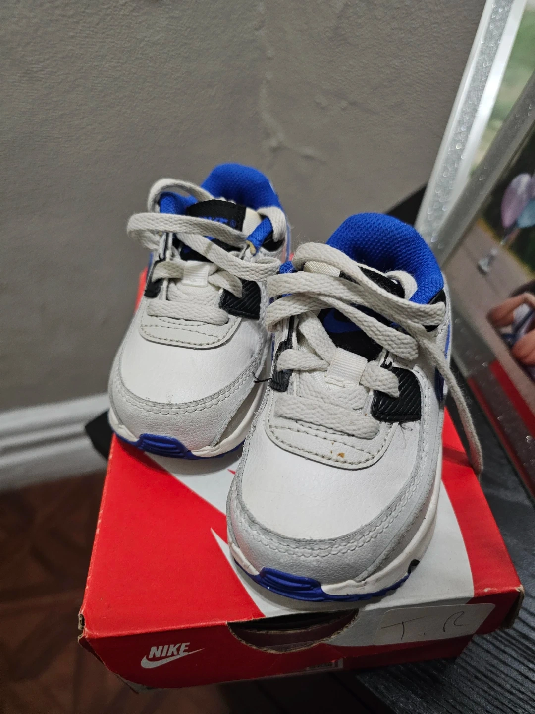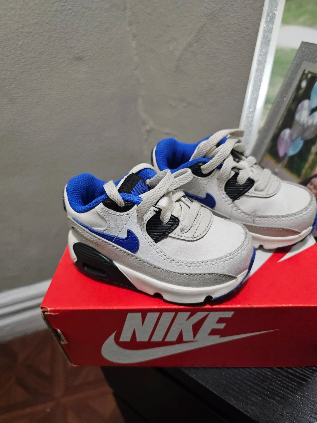 Toddler Nike Air Max 90 LTR TD crib shoes. White, blue, and gray leather and synthetic upper. Lace-up closure. Includes original box. US toddler size 5c, UK 4.5, EU 21.