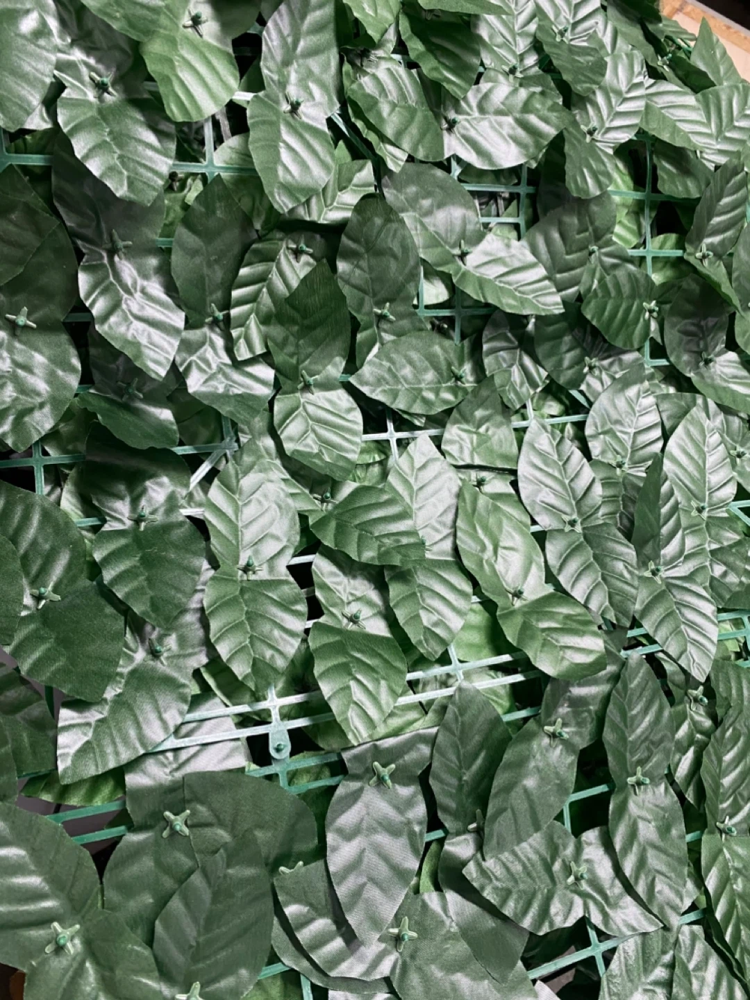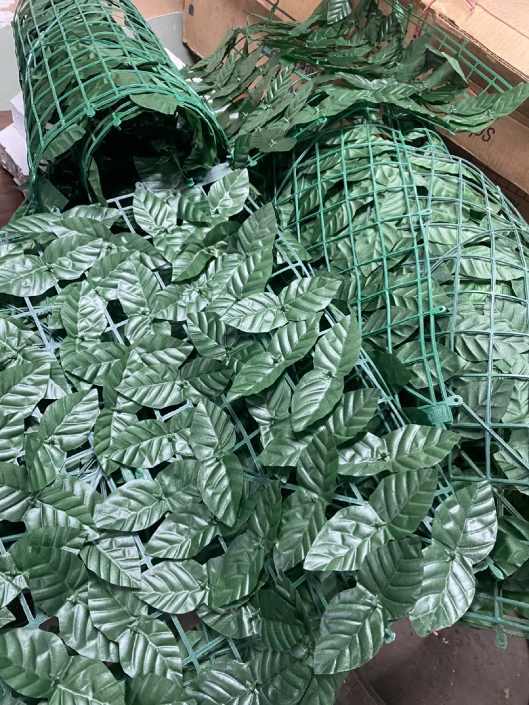 Artificial ivy leaf garland designed to look like a fence screen. It's a green, plastic material. This roll is perfect for adding greenery to outdoor spaces or as a decorative covering. Can be used for privacy screens or event backdrops!