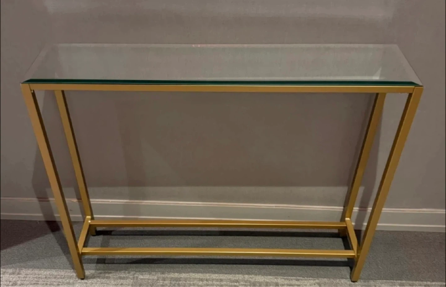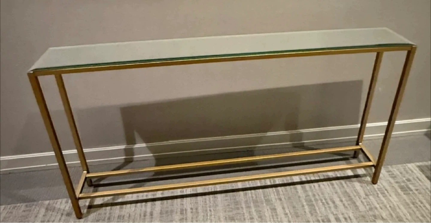 Sleek console table with a gold metal frame and a clear glass top. It features a lower shelf for added storage or display space. This table's modern design fits well in entryways or living areas.