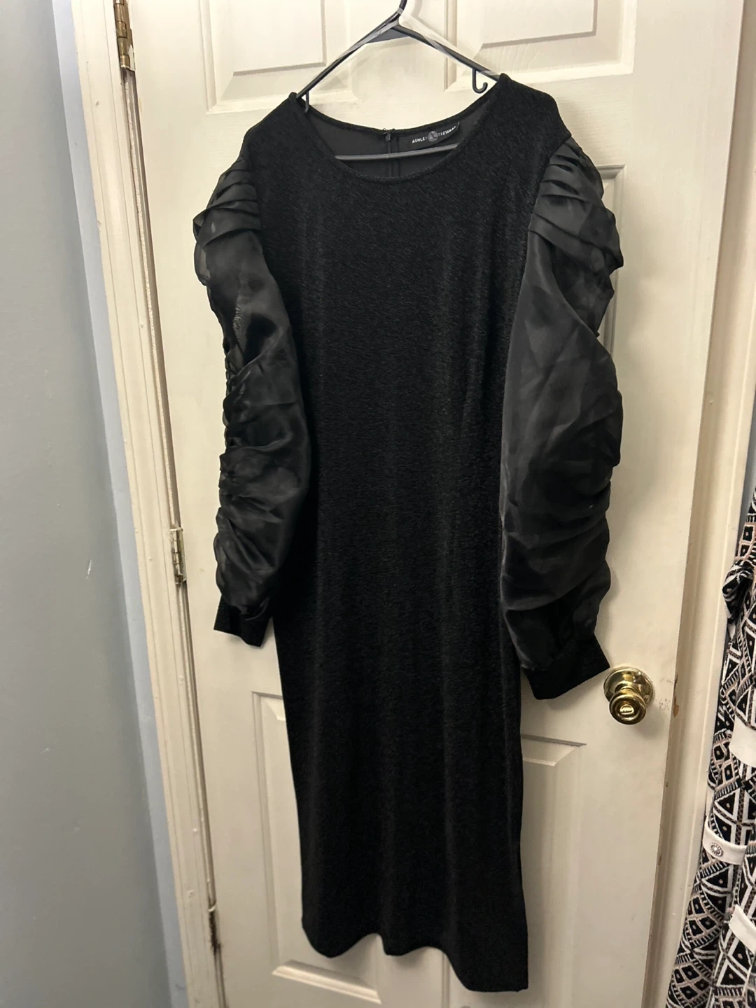 Black midi dress with textured fabric on the bodice and sleeves. Features dramatic ruched puff sleeves. Zipper closure in the back. It's a stylish piece for an evening out!