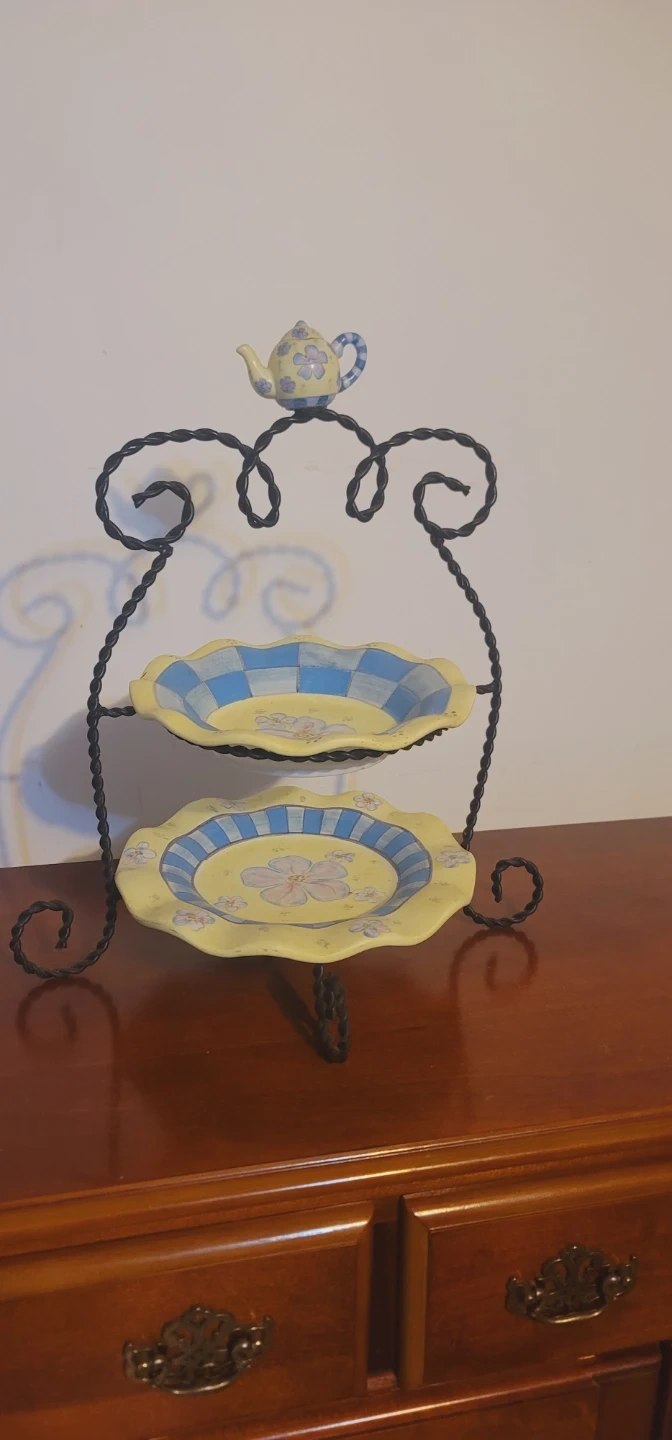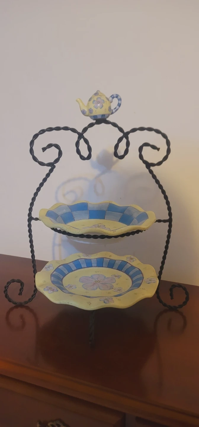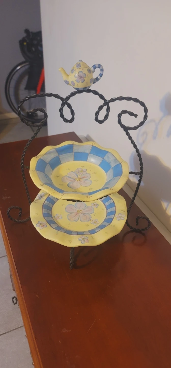 This charming 2-tier display stand features yellow plates with blue checkered and floral designs. It's topped with a decorative teapot. Perfect for serving snacks or displaying small items!