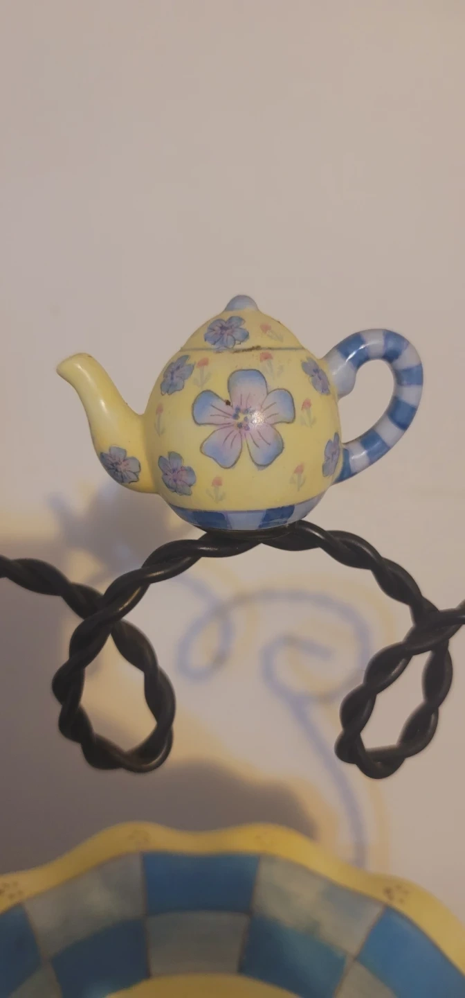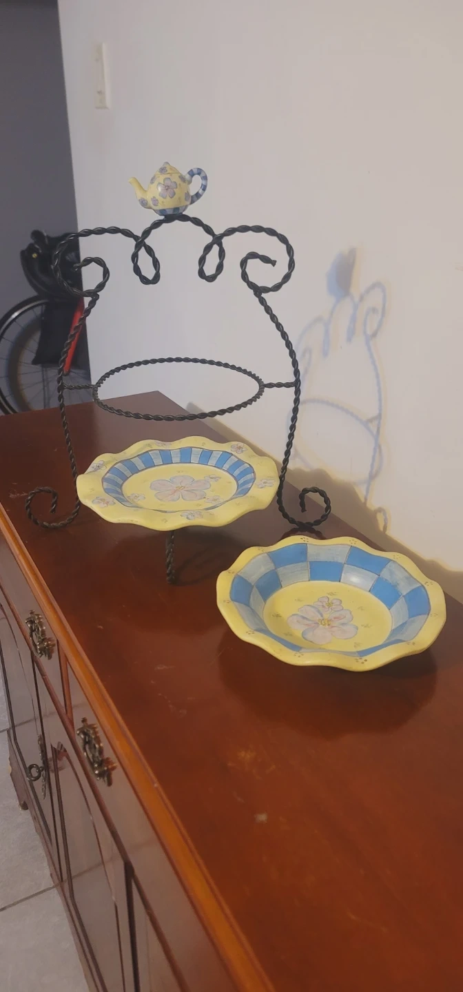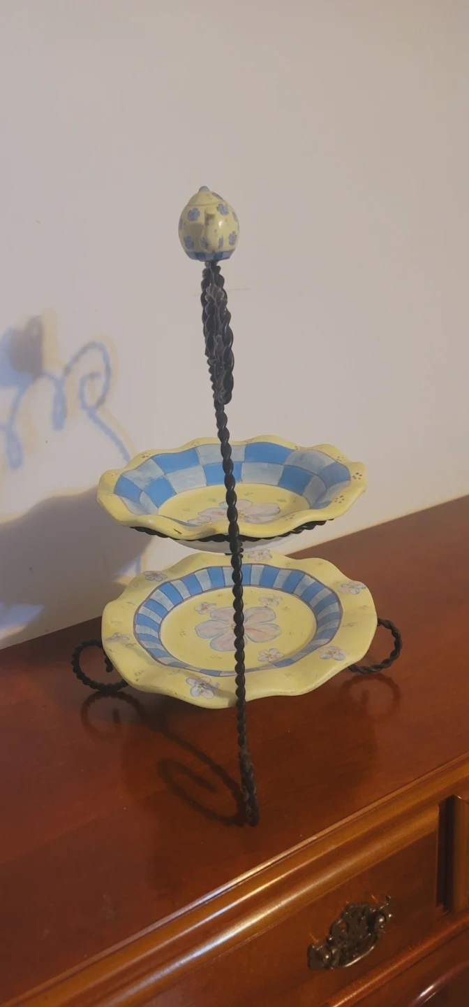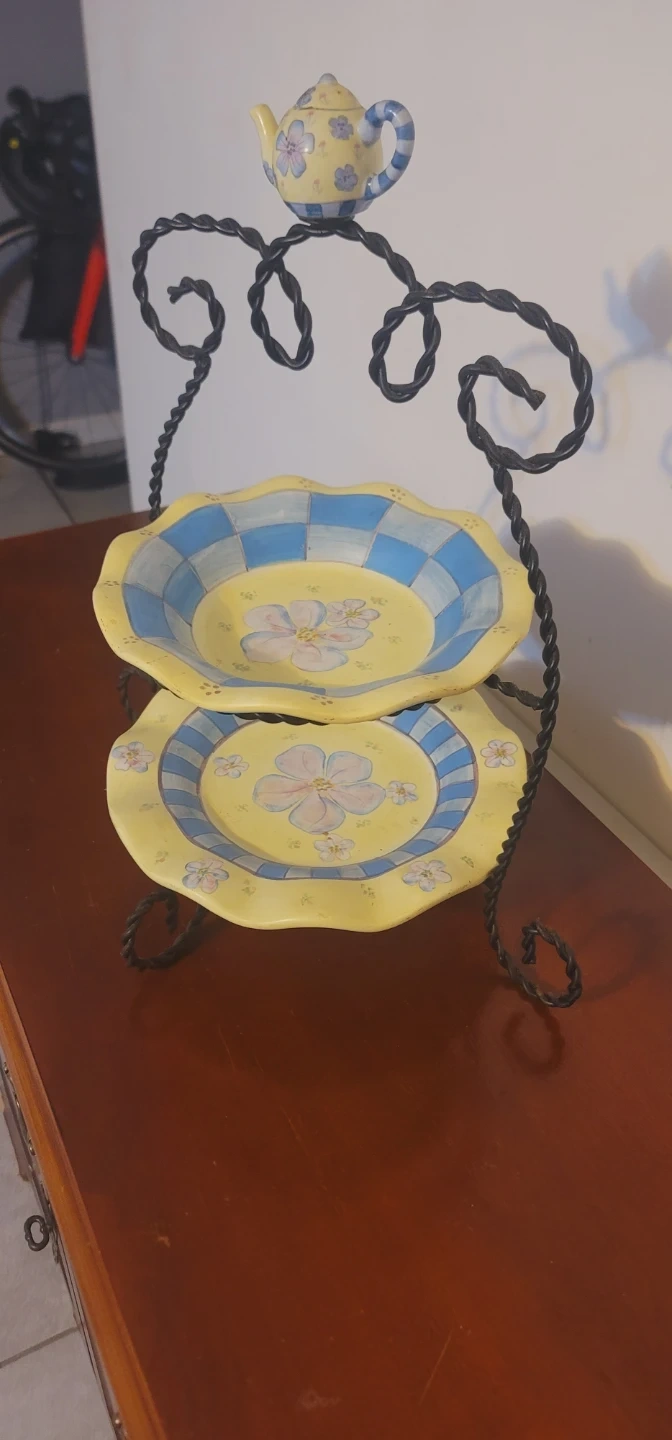 This charming 2-tier display stand features yellow plates with blue checkered and floral designs. It's topped with a decorative teapot. Perfect for serving snacks or displaying small items!