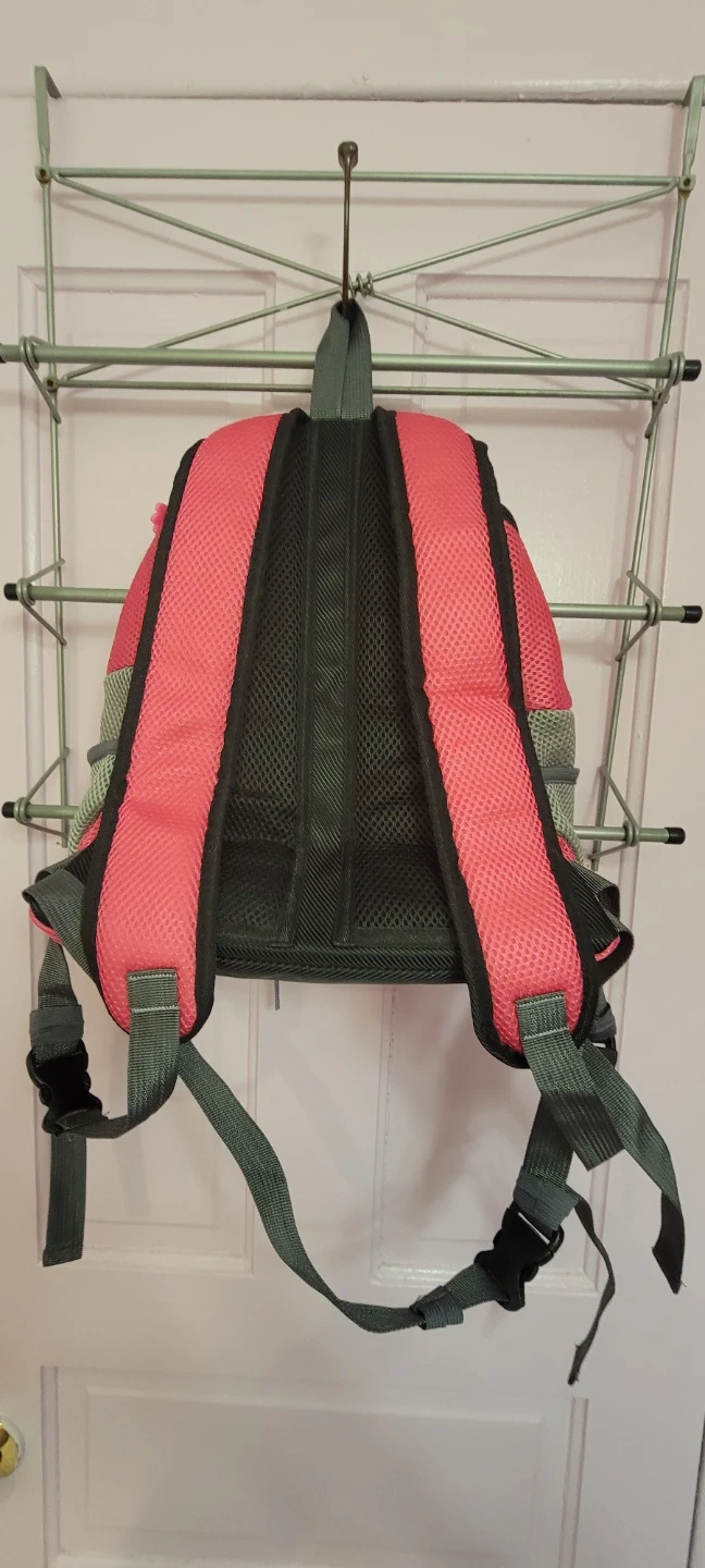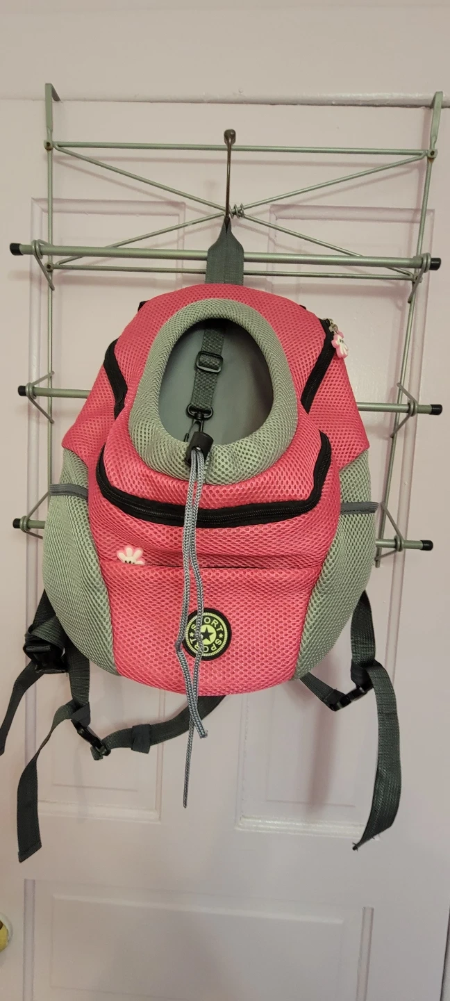 This pet carrier frontpack is designed for small pets. It's made with mesh panels for ventilation and has adjustable shoulder straps for comfort. It features a zippered front pocket and a drawstring closure at the top.