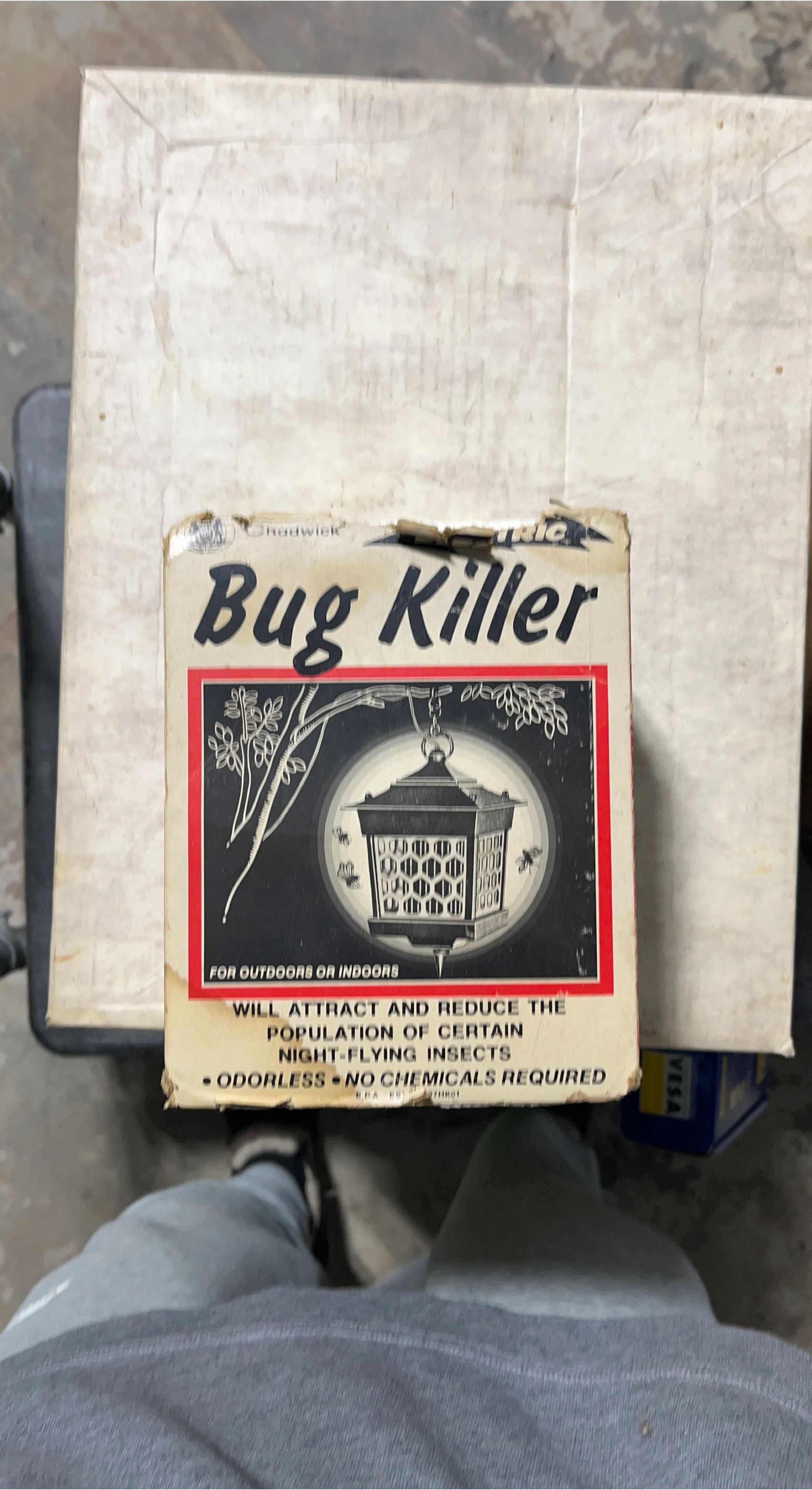 83Selling a Chadwick Bug Killer, designed for both indoor and outdoor use. It attracts and reduces the population of certain night-flying insects, and it's odorless with no chemicals required. It comes with a hanging bulb. Slide out the bottom plate after you unplug.