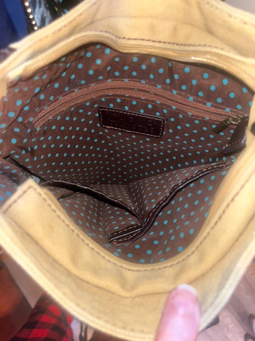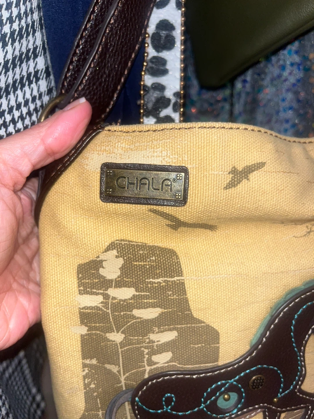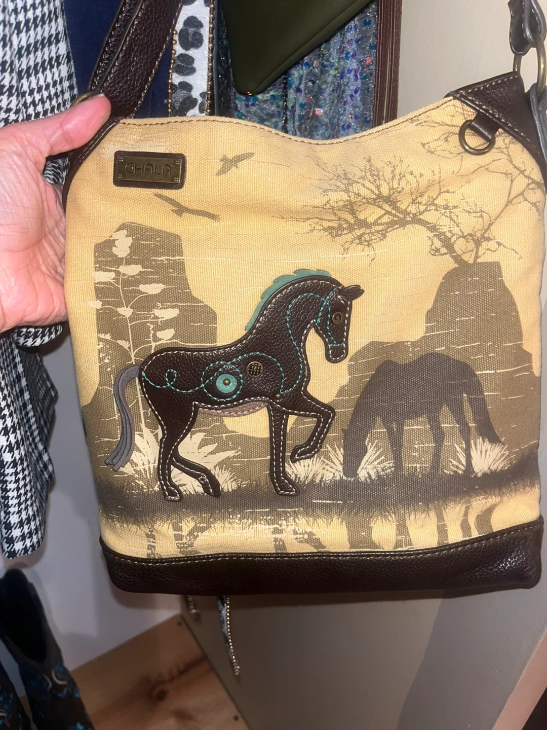 15Here's a cute Chala shoulder bag! It's a canvas bag with a horse design on the front. The interior lining is brown with blue polka dots. It's in good condition and ready for a new home Will ship for $12