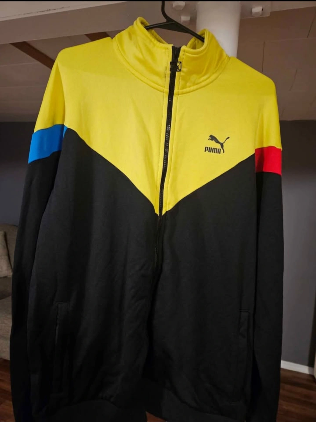 Selling a Puma track jacket in black and yellow. It has a cool design with blue and red accents on the sleeves. Great for workouts or casual wear!