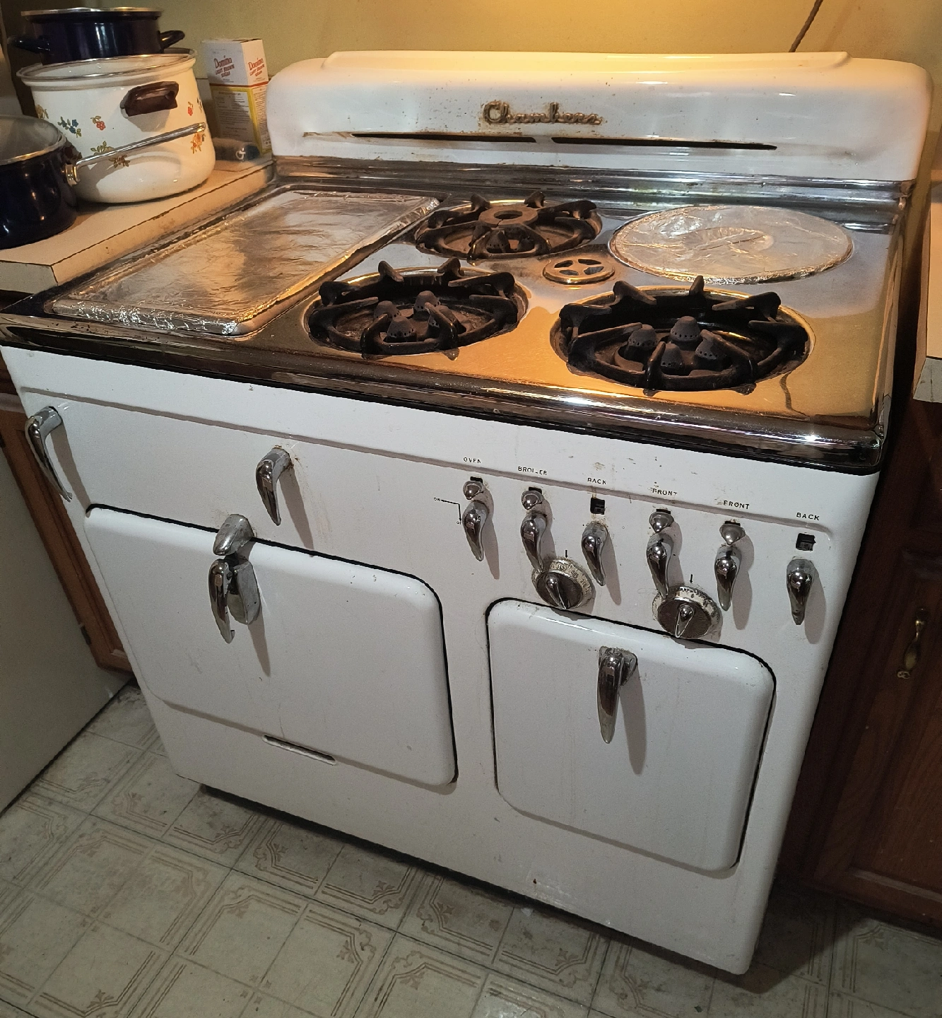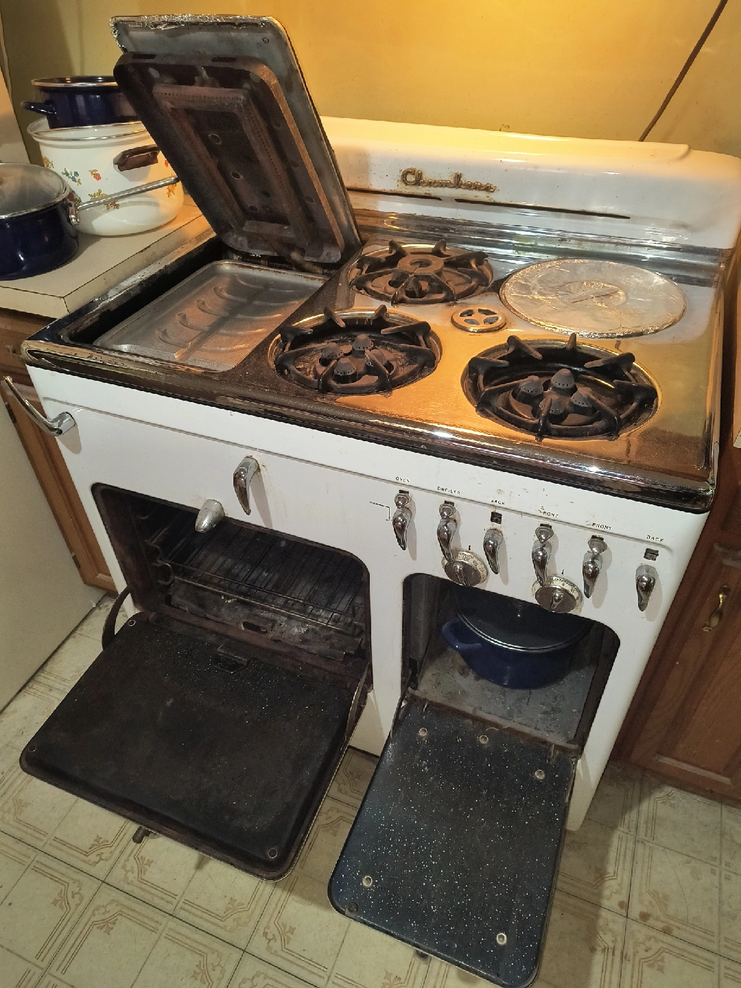Selling a Chambers antique gas stove. Unique design with top broiler/griddle, stone-lined oven that roasts on retained heat, deep well Dutch oven, and pot storage. Gas valves have removable keys for child safety.