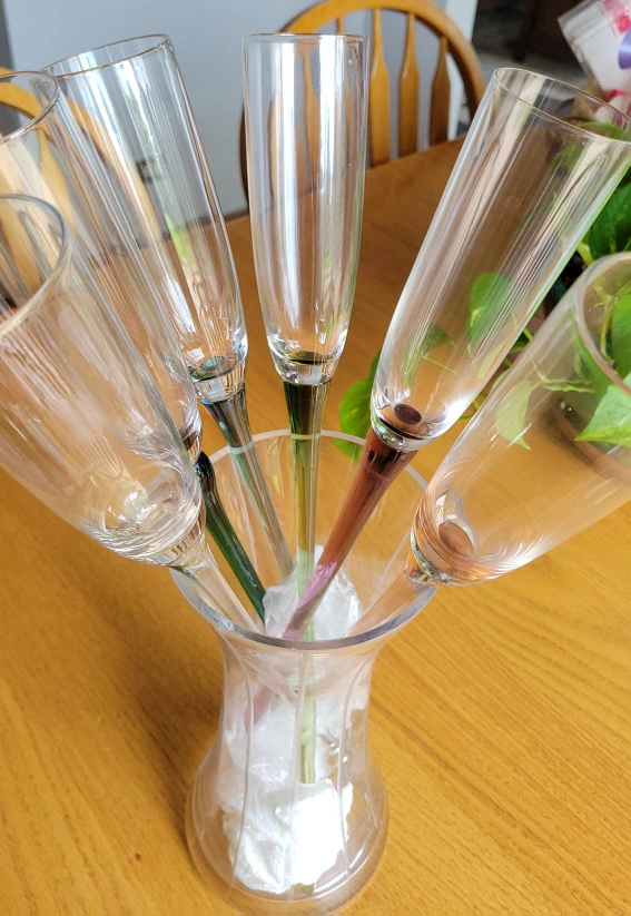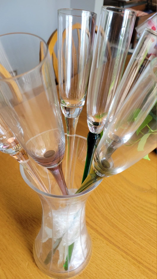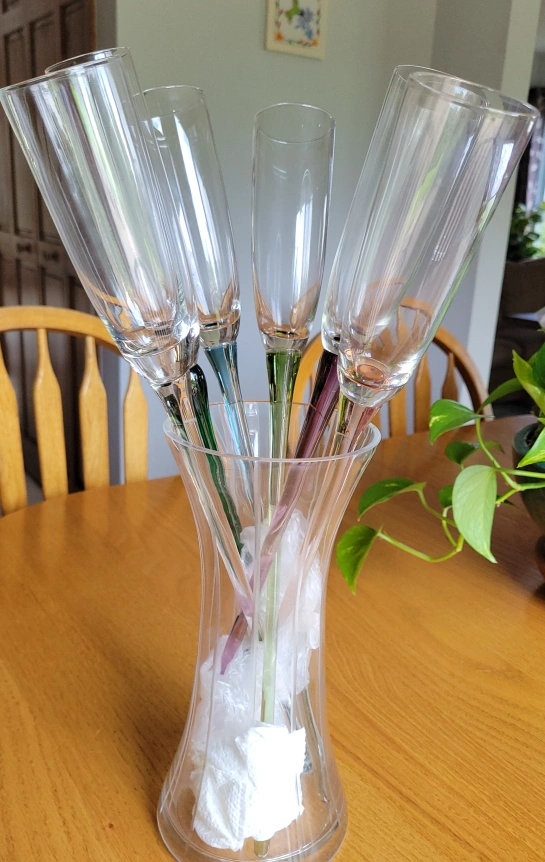 65Selling a set of champagne flutes displayed in a clear vase. These elegant glasses are perfect for celebrations or adding a touch of sophistication to your home decor. They each have their own color so you always know which one is yours. They are in great condition and ready to be enjoyed!