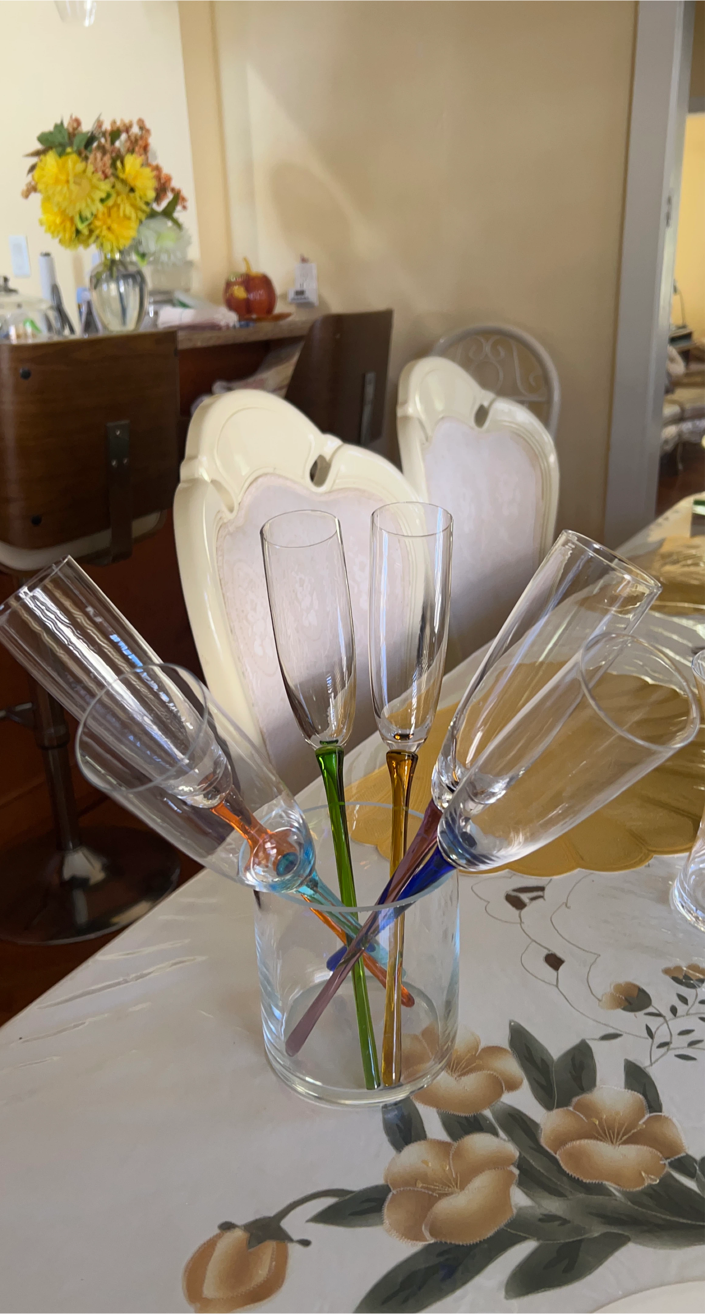 Set of champagne flutes with various colored stems. They're in great condition and ready to add a pop of color to your next celebration!