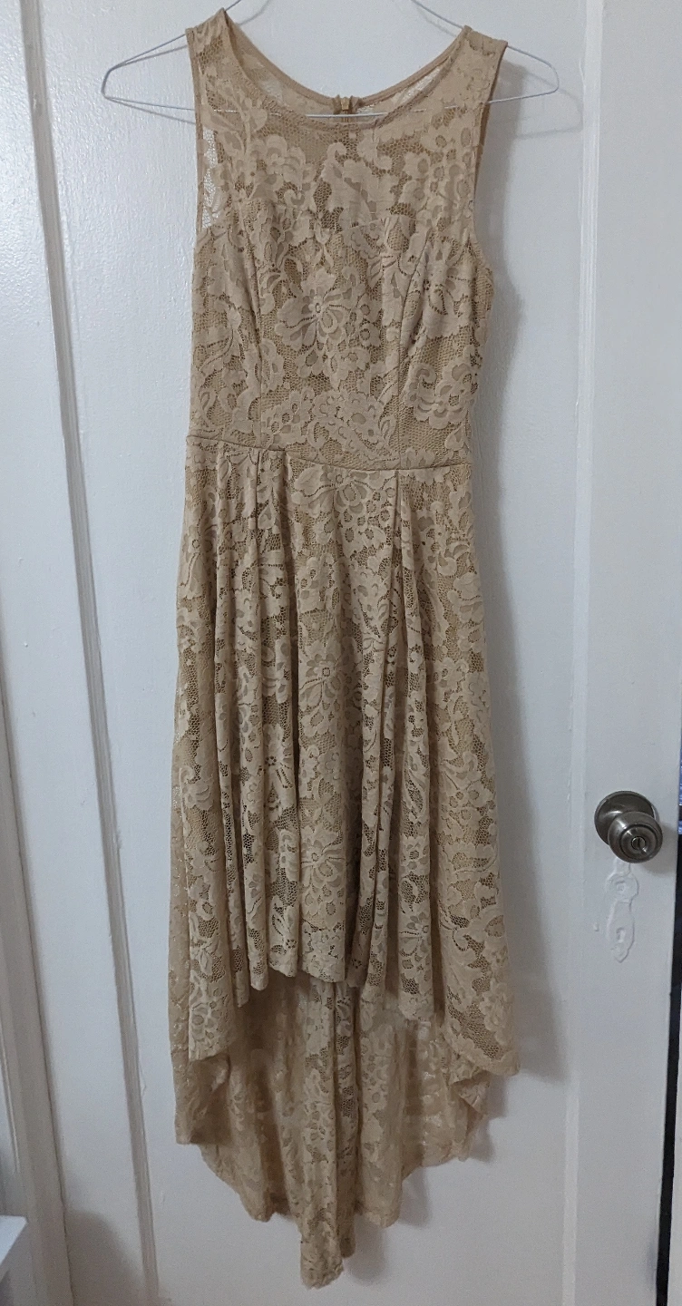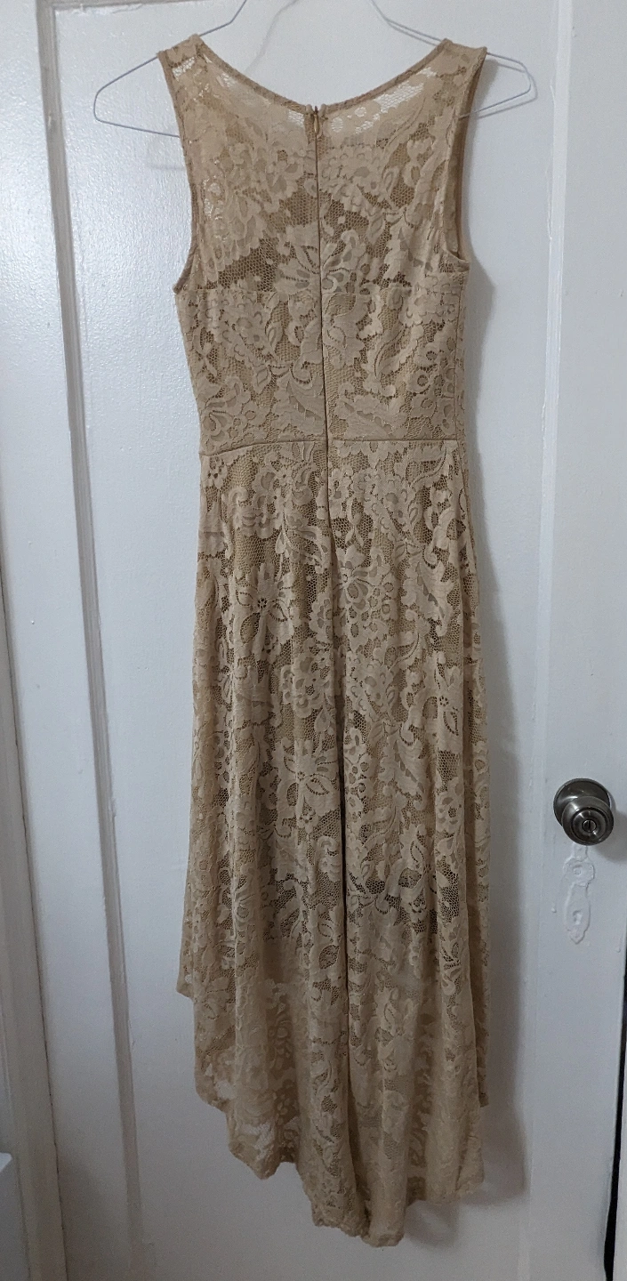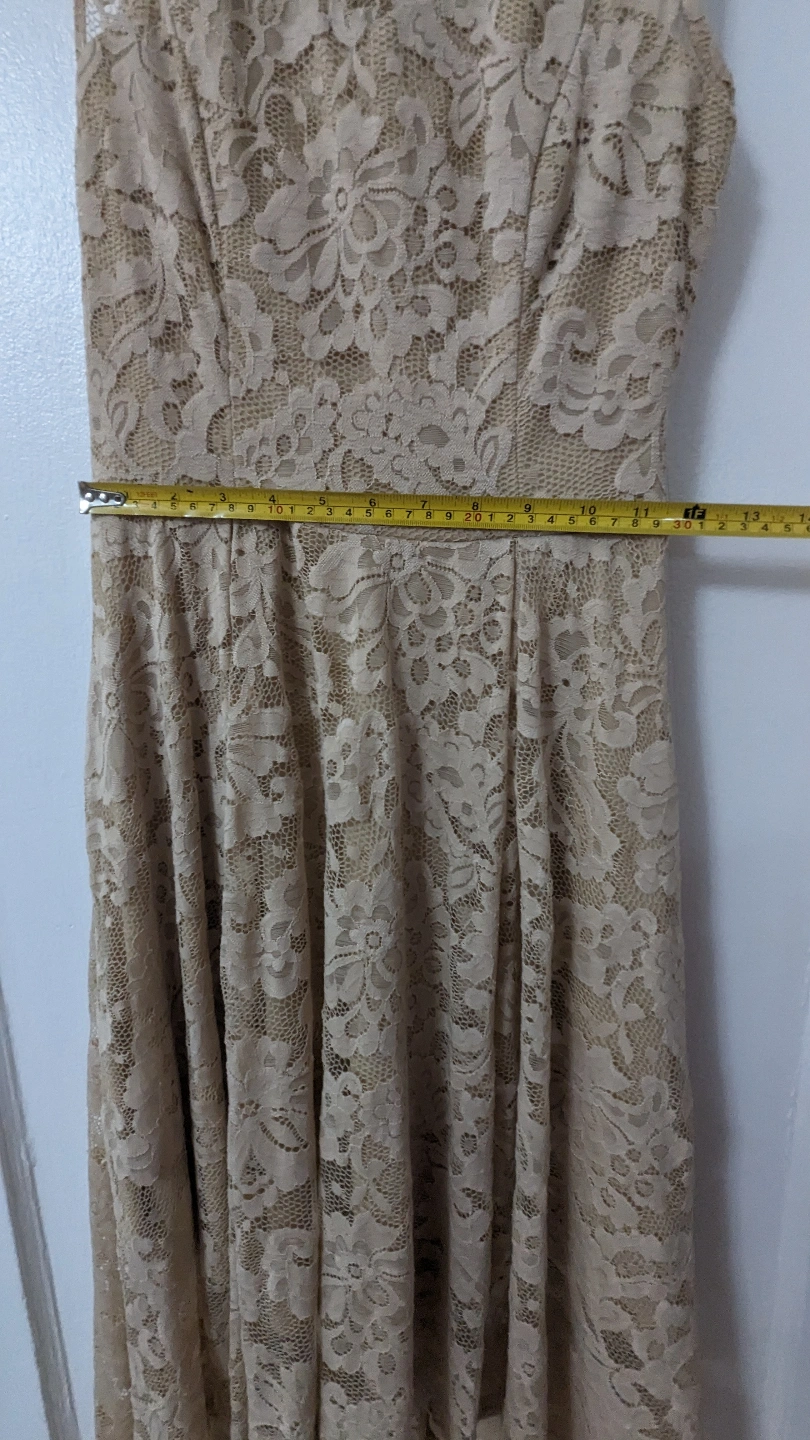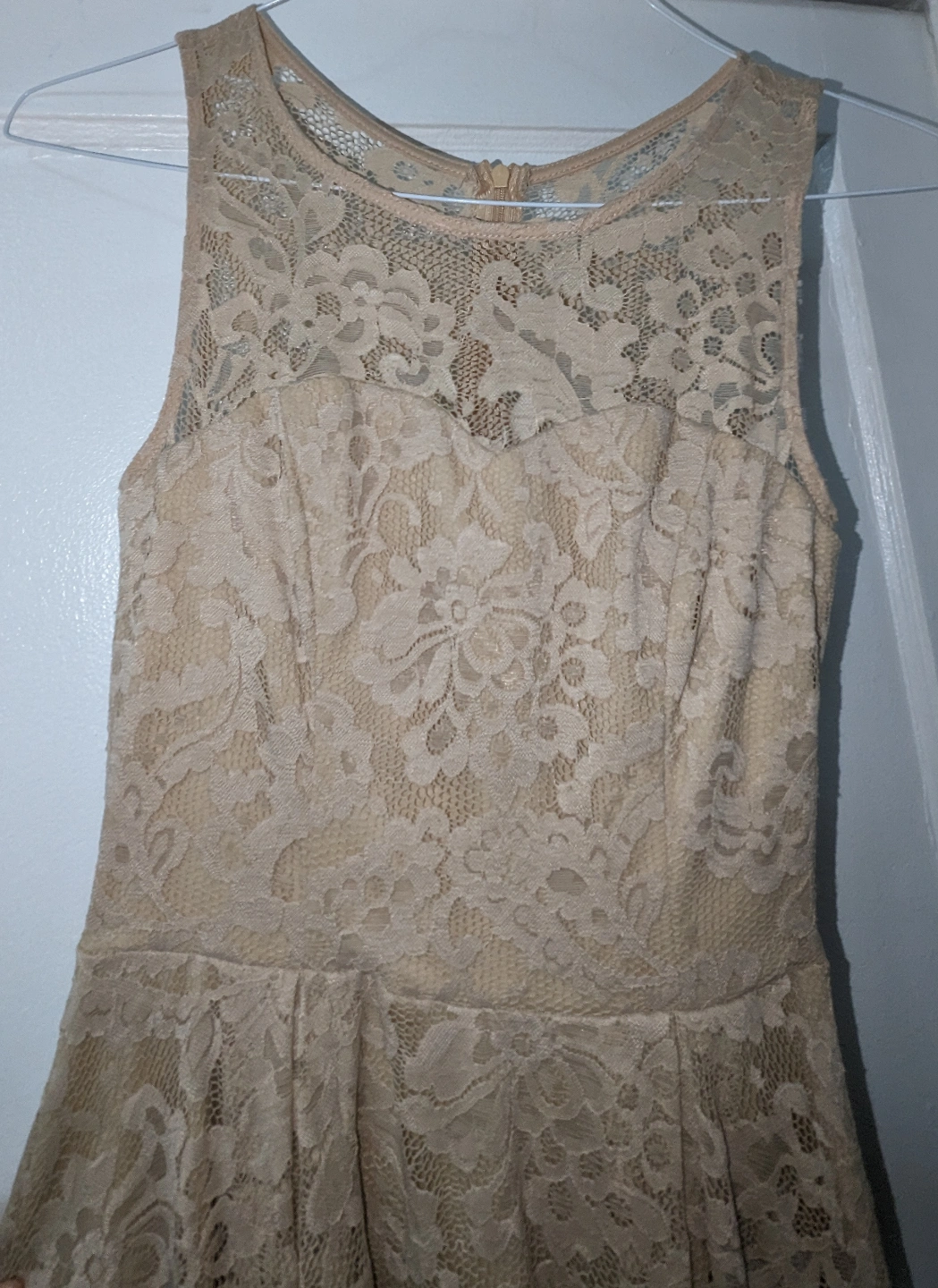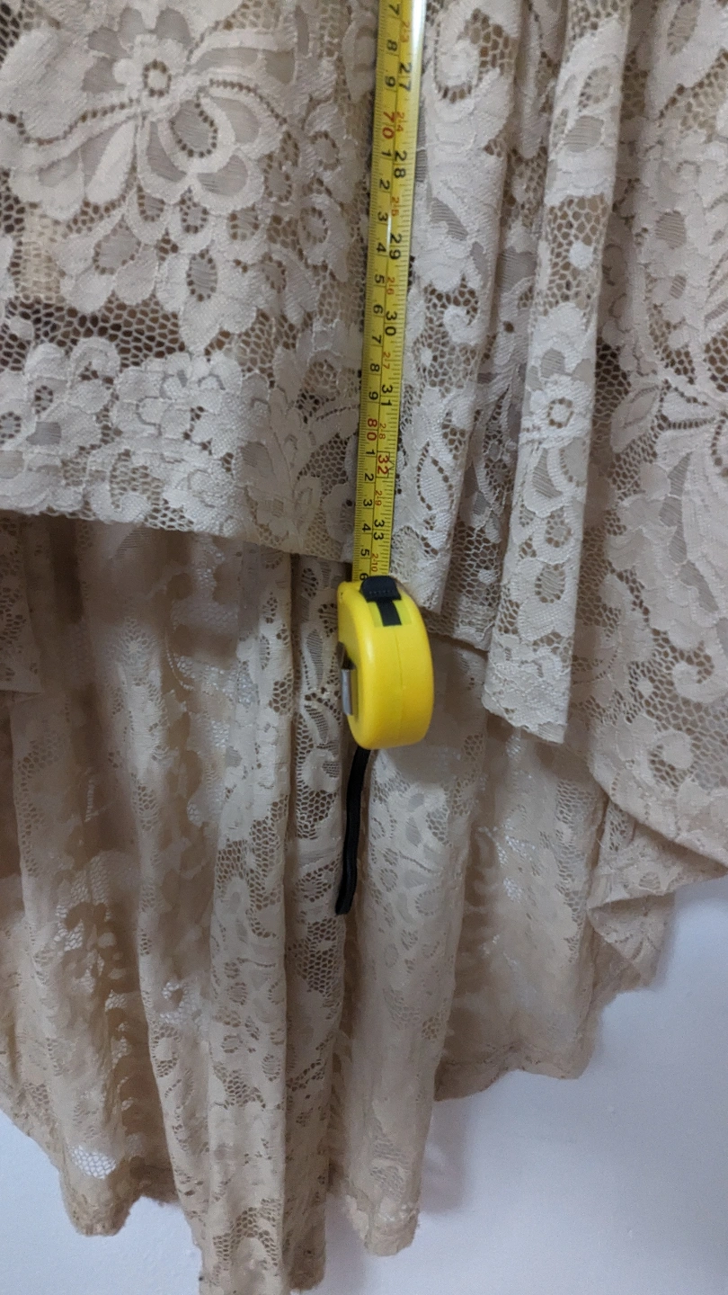 Nude/Champagne/Beige lace dress perfect for layering Gorgeous high low effect Very stretchy so can fit XS up to an M Would be great as a base for renfair outfits or a pretty cocktail dress for teens Lay Flat Measurements: Pit to pit - 13 in Waist - 11.5 in unstretched but up to 15 in stretched Neckline to front skirt hem - 33 in Strap to back skirt hem - 53 in