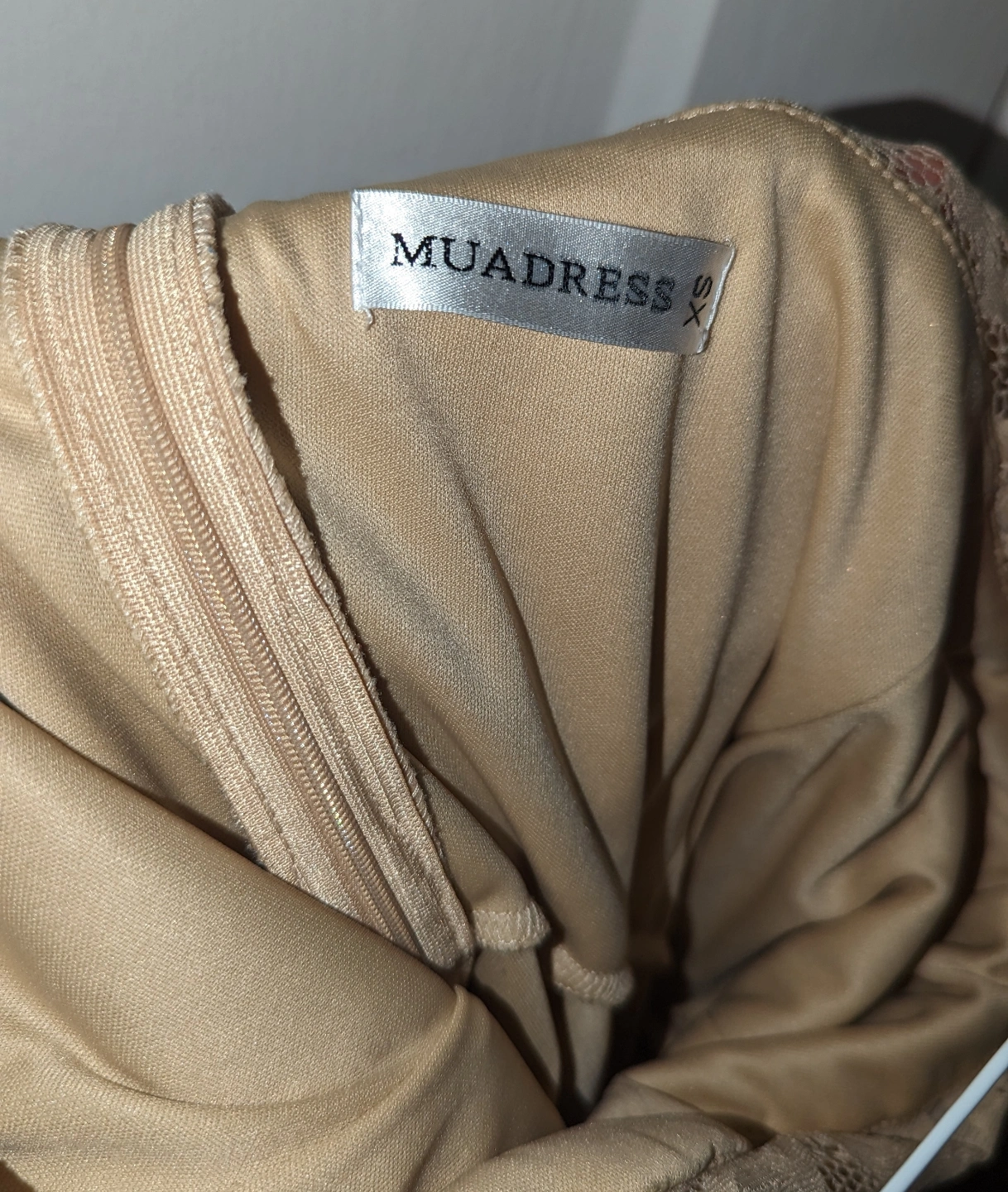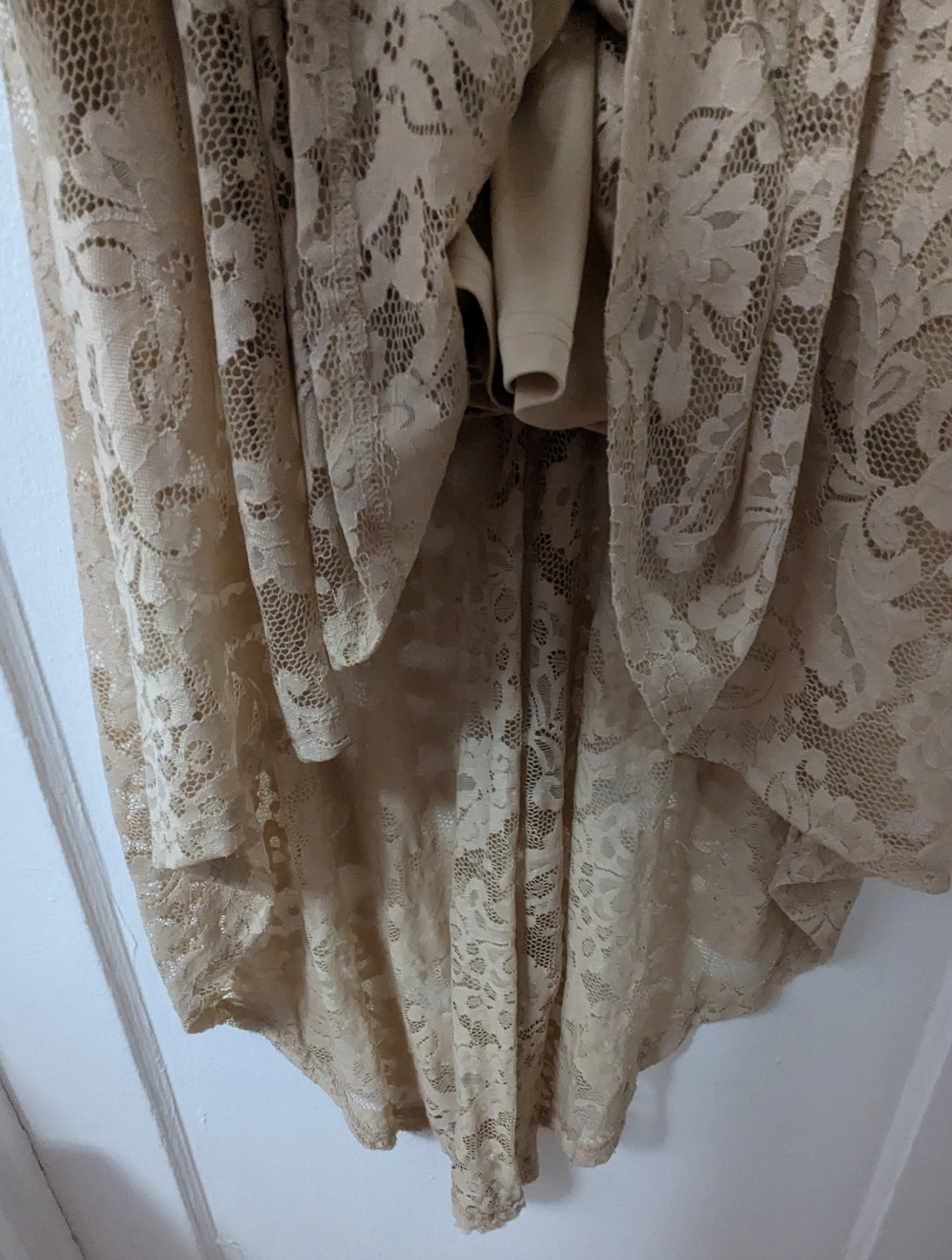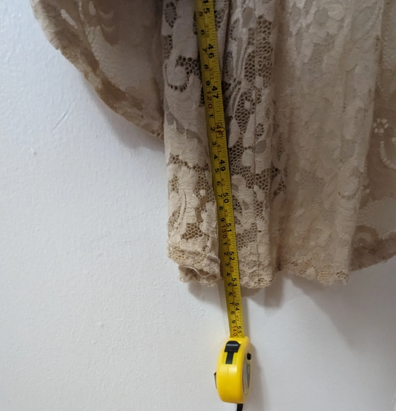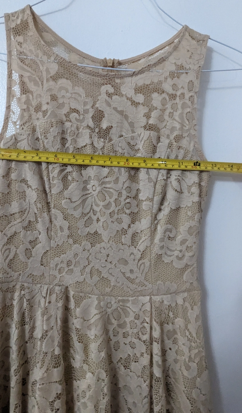Nude/Champagne/Beige lace dress perfect for layering Gorgeous high low effect Very stretchy so can fit XS up to an M Would be great as a base for renfair outfits or a pretty cocktail dress for teens Lay Flat Measurements: Pit to pit - 13 in Waist - 11.5 in unstretched but up to 15 in stretched Neckline to front skirt hem - 33 in Strap to back skirt hem - 53 in