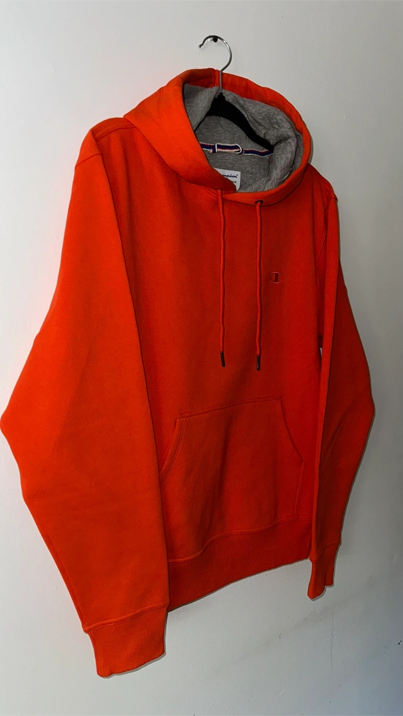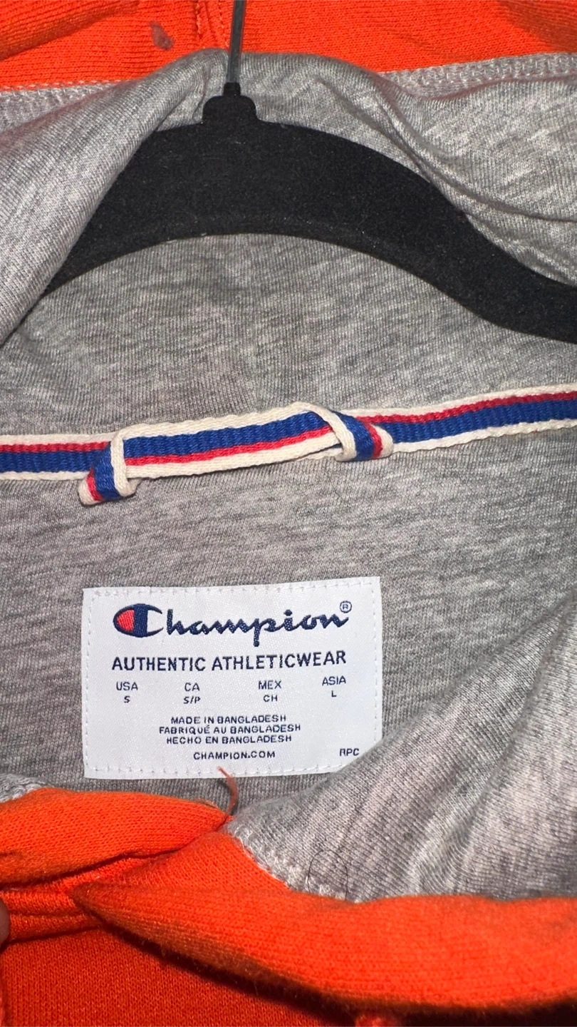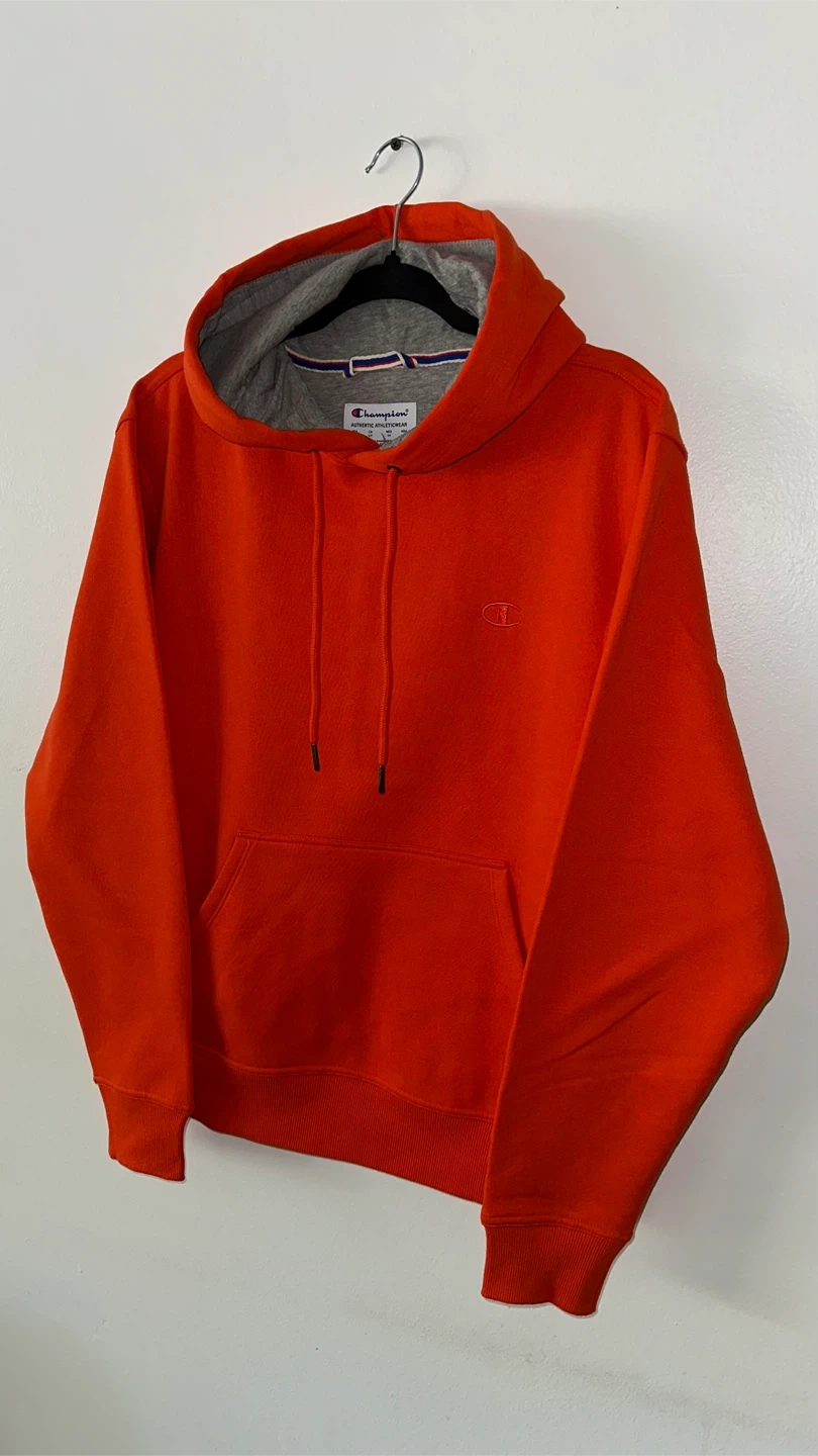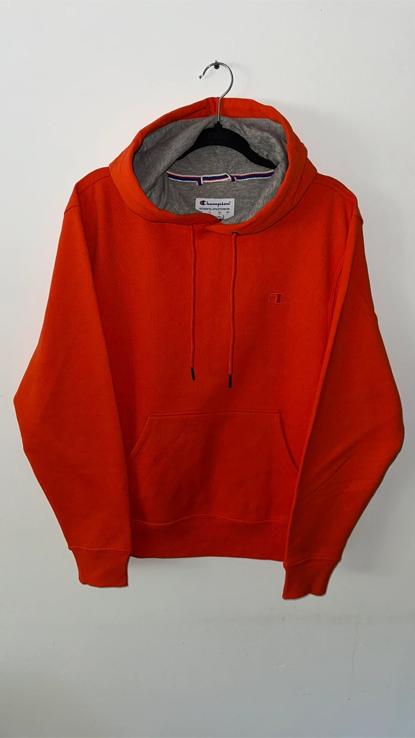 Selling a Champion Authentic Athleticwear hoodie in a vibrant orange color. It's a size small and has a classic, comfortable fit. Perfect for casual wear or workouts!