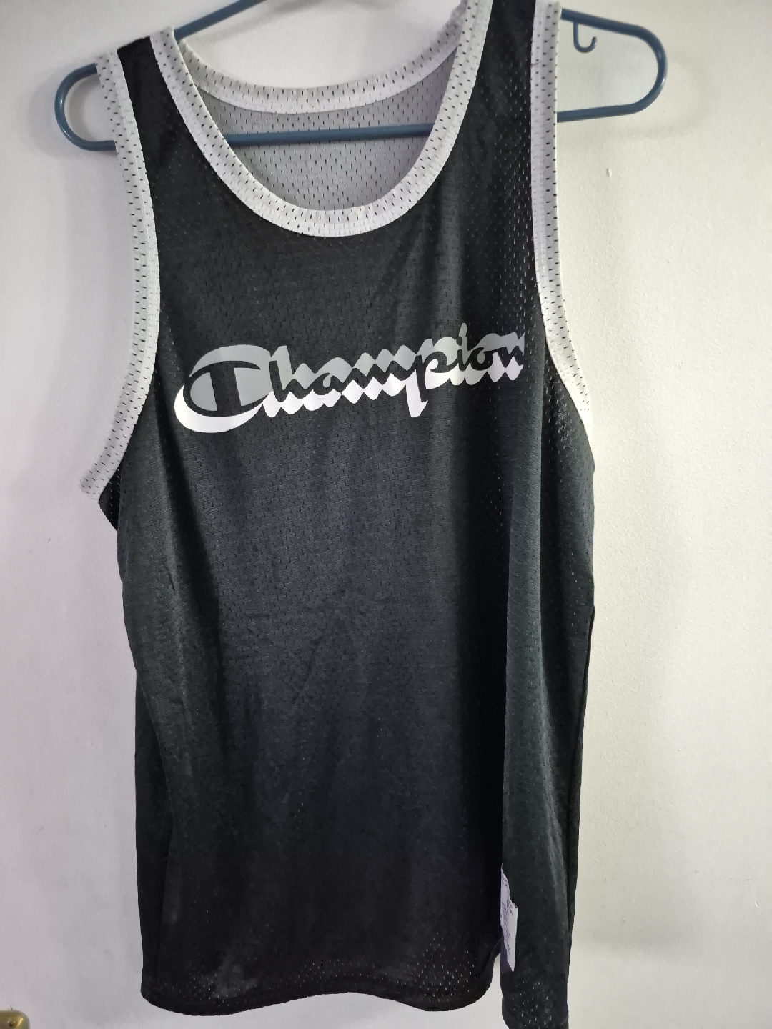 Selling a used reversible Champion black mesh tank top. It's in goos condition and perfect for sports or casual wear. The mesh material makes it breathable and comfortable. The classic Champion logo is featured prominently on the front