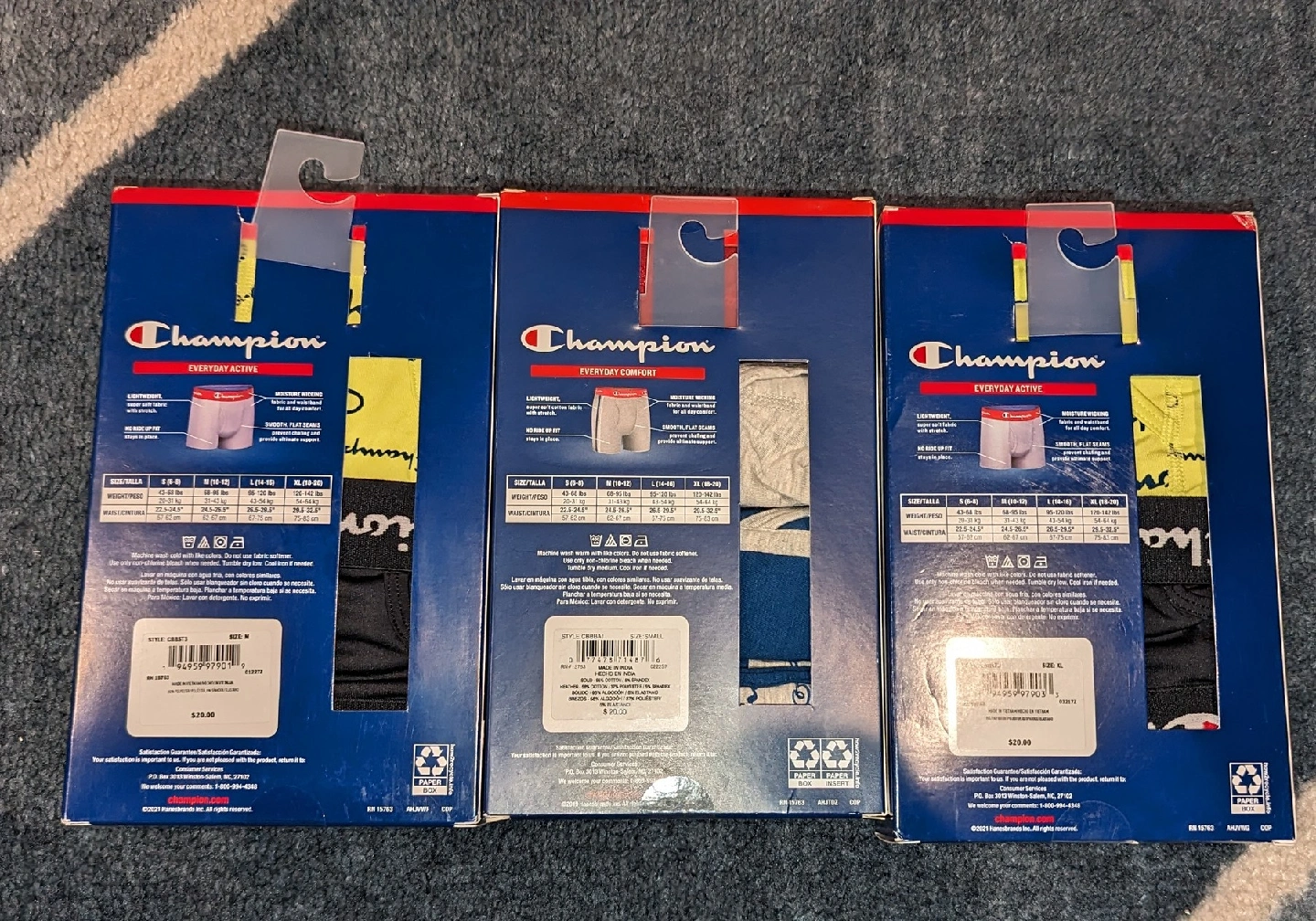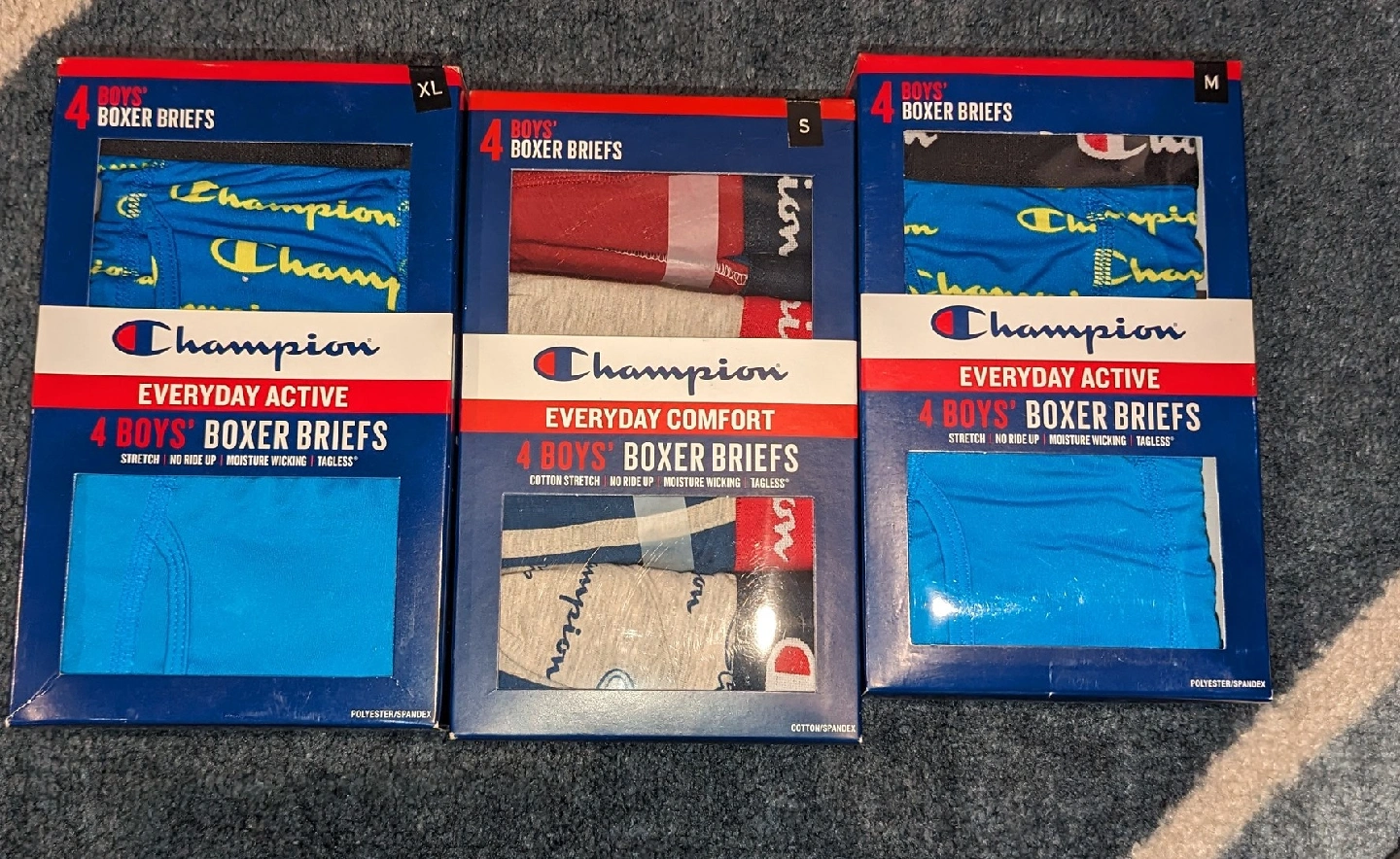 I have three packs of Champion boys' boxer briefs. You can buy 3 packs of any size for $21 as long as they are available.One pack is size small, one is medium, and the other is extra large. They are brand new in the box. The small pack is the Everyday Comfort style, while the medium and extra large packs are the Everyday Active style. Each pack contains 4 pairs of boxer briefs