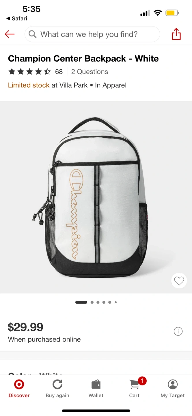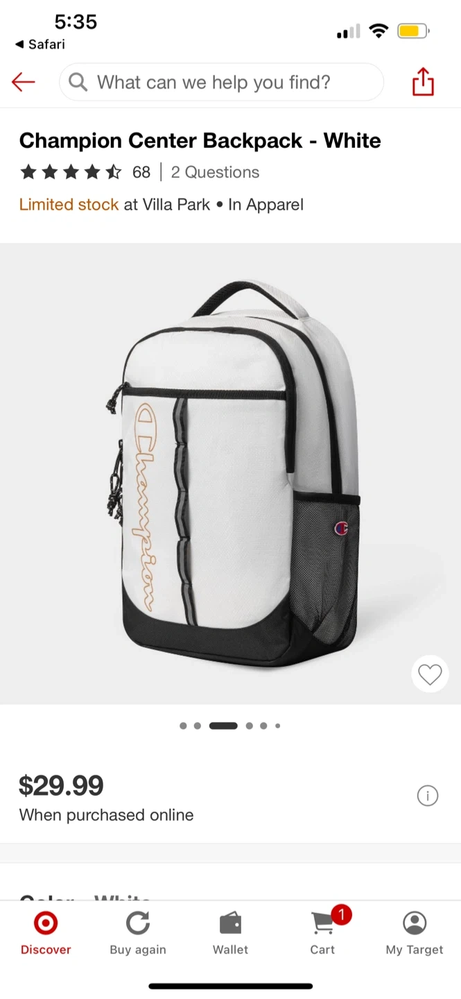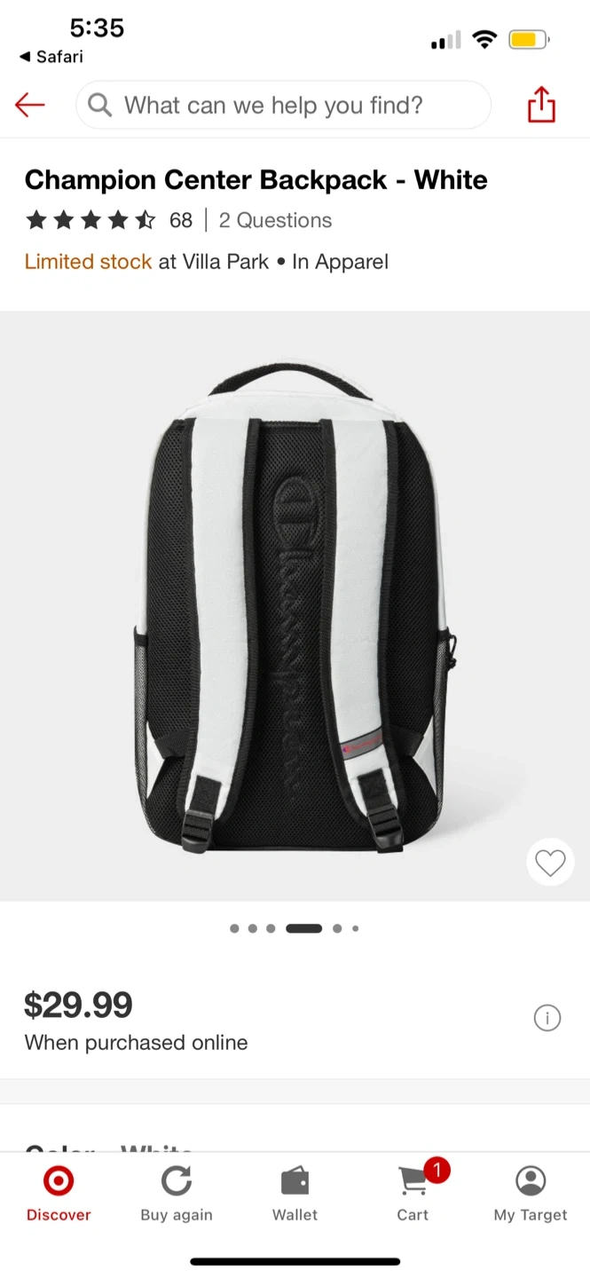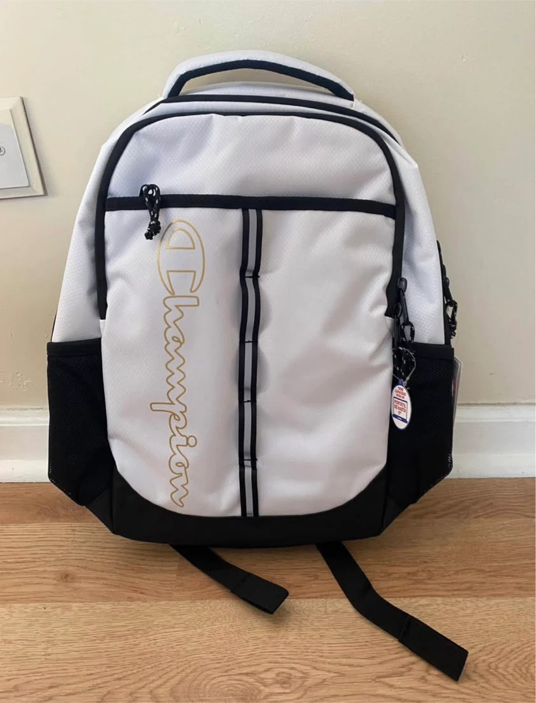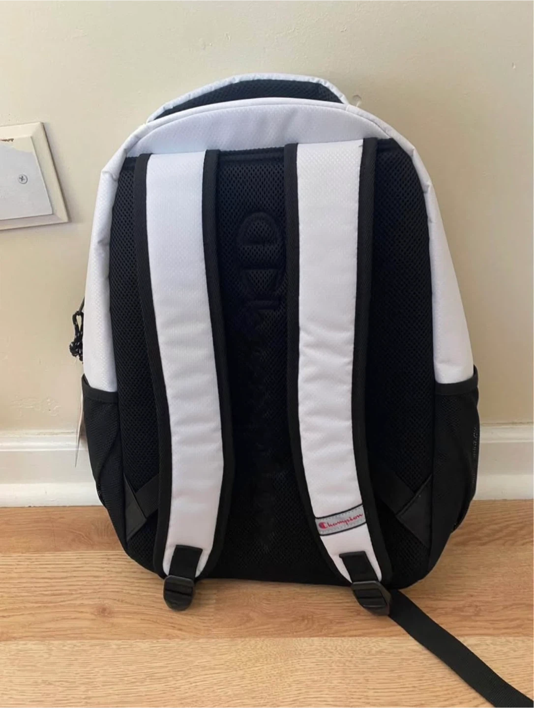 73Selling a Champion Center Backpack in white! This backpack features the Champion logo and is perfect for everyday use. Originally bought for $29.99