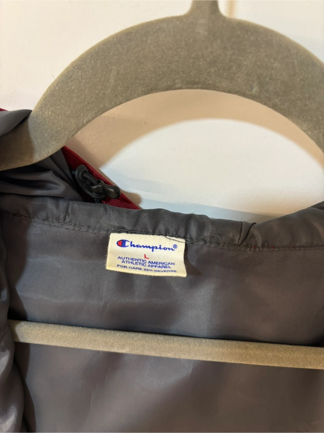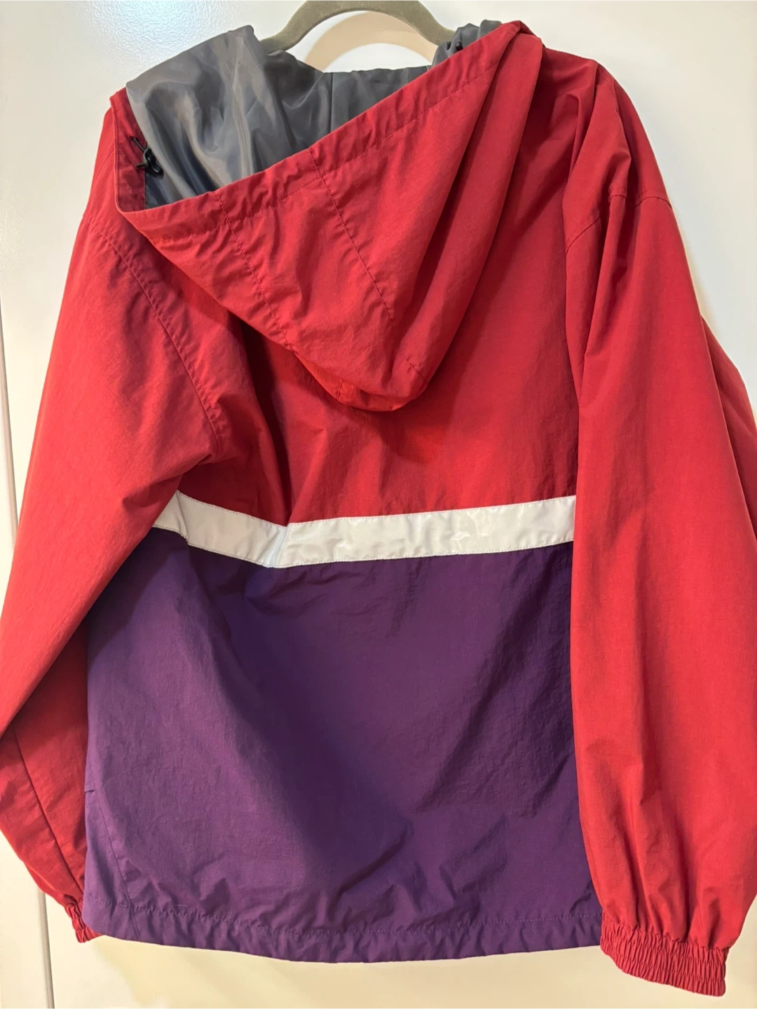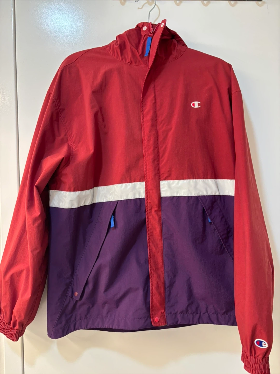 Selling a Champion color block windbreaker jacket! It features a unique design with red, white, and purple colors. Perfect for outdoor activities or casual wear. Bought it from Japan