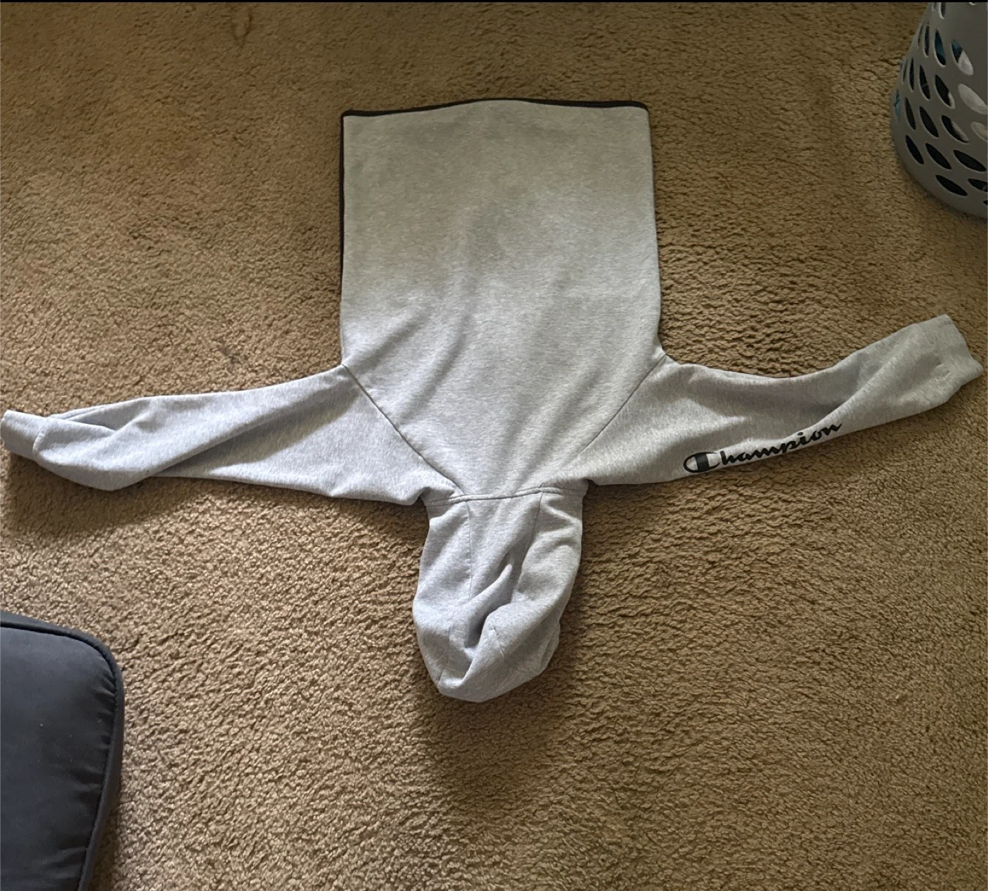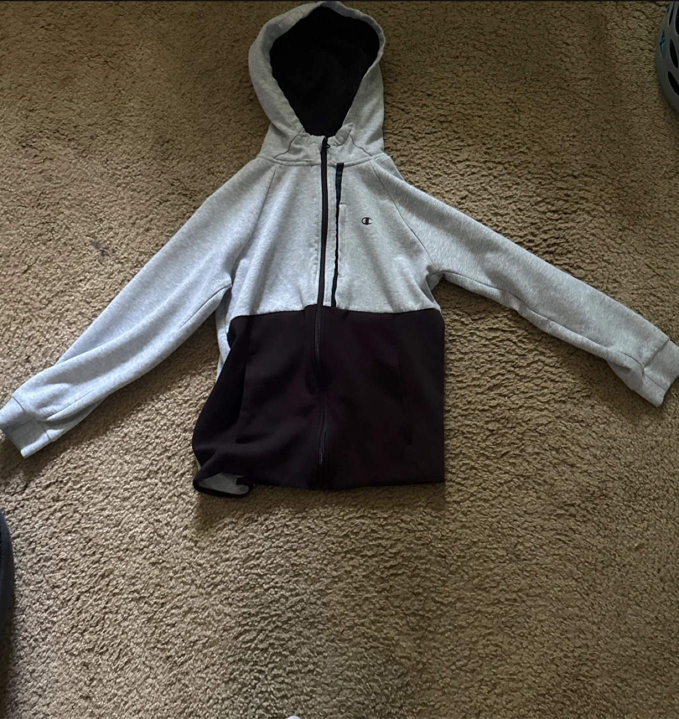 Selling a Champion full zip hoodie in gray and black. It features the Champion logo on the sleeve and chest. Perfect for layering or wearing on its own